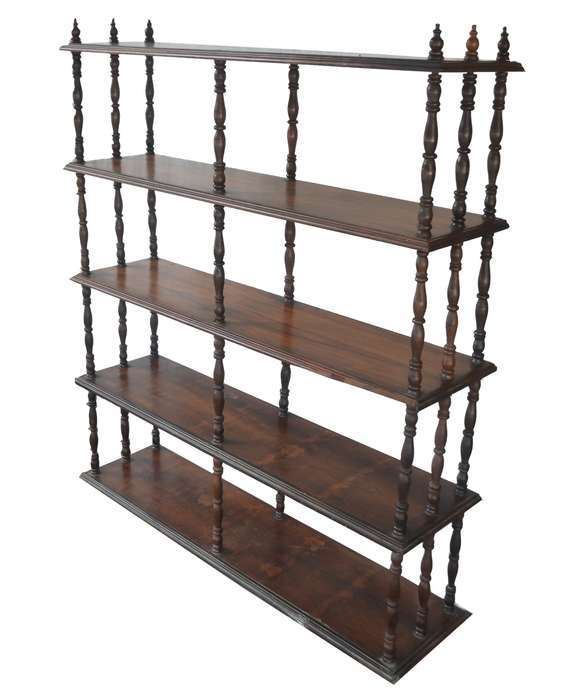 Estante de madeira nobre com 4 prateleiras unidas por finas colunas torneadas. Faltando dois pinos. Desgastes.