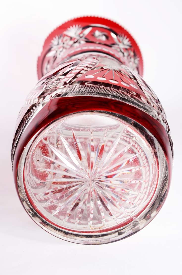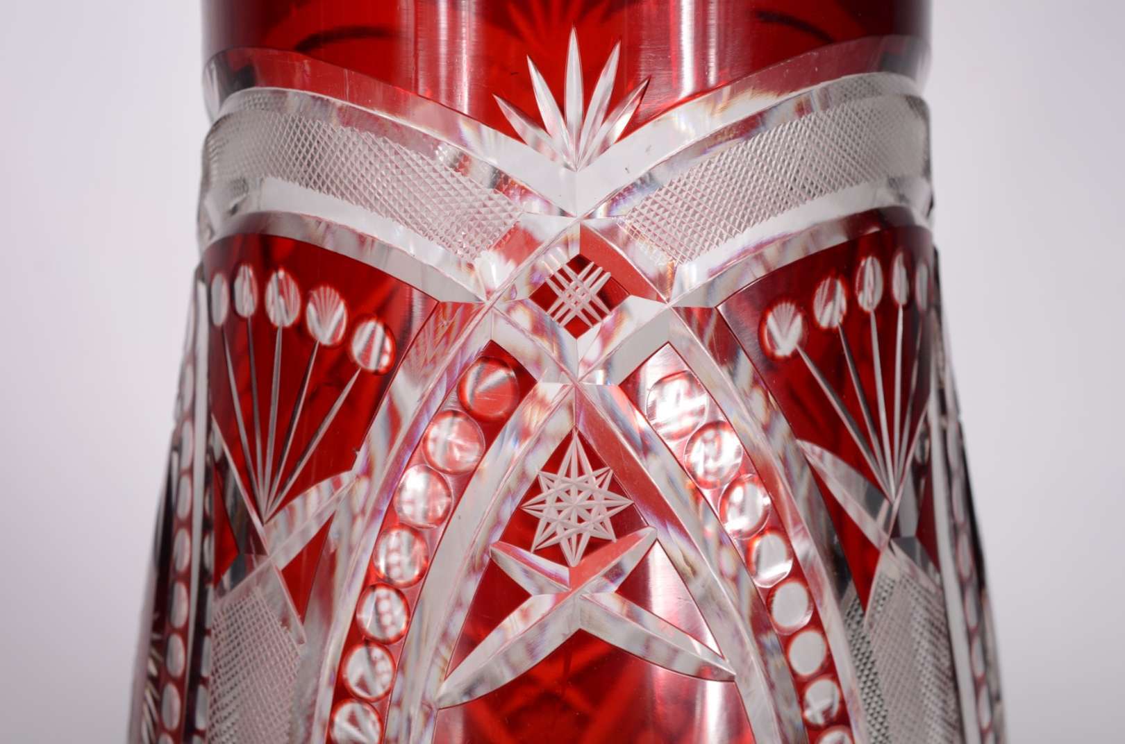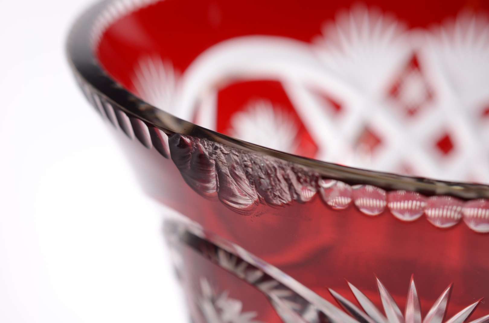 Conjunto de licoreira com 6 cálices e presentoir de cristal europeu doublé rubi lapidado. Pequenos lascados no presen...