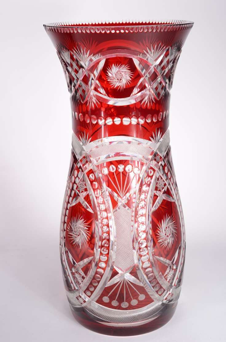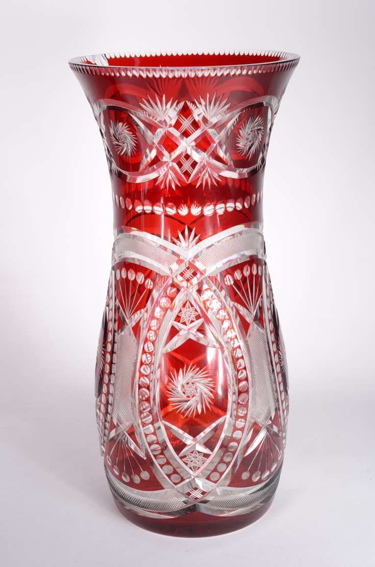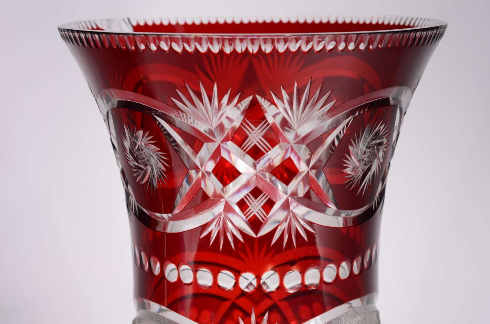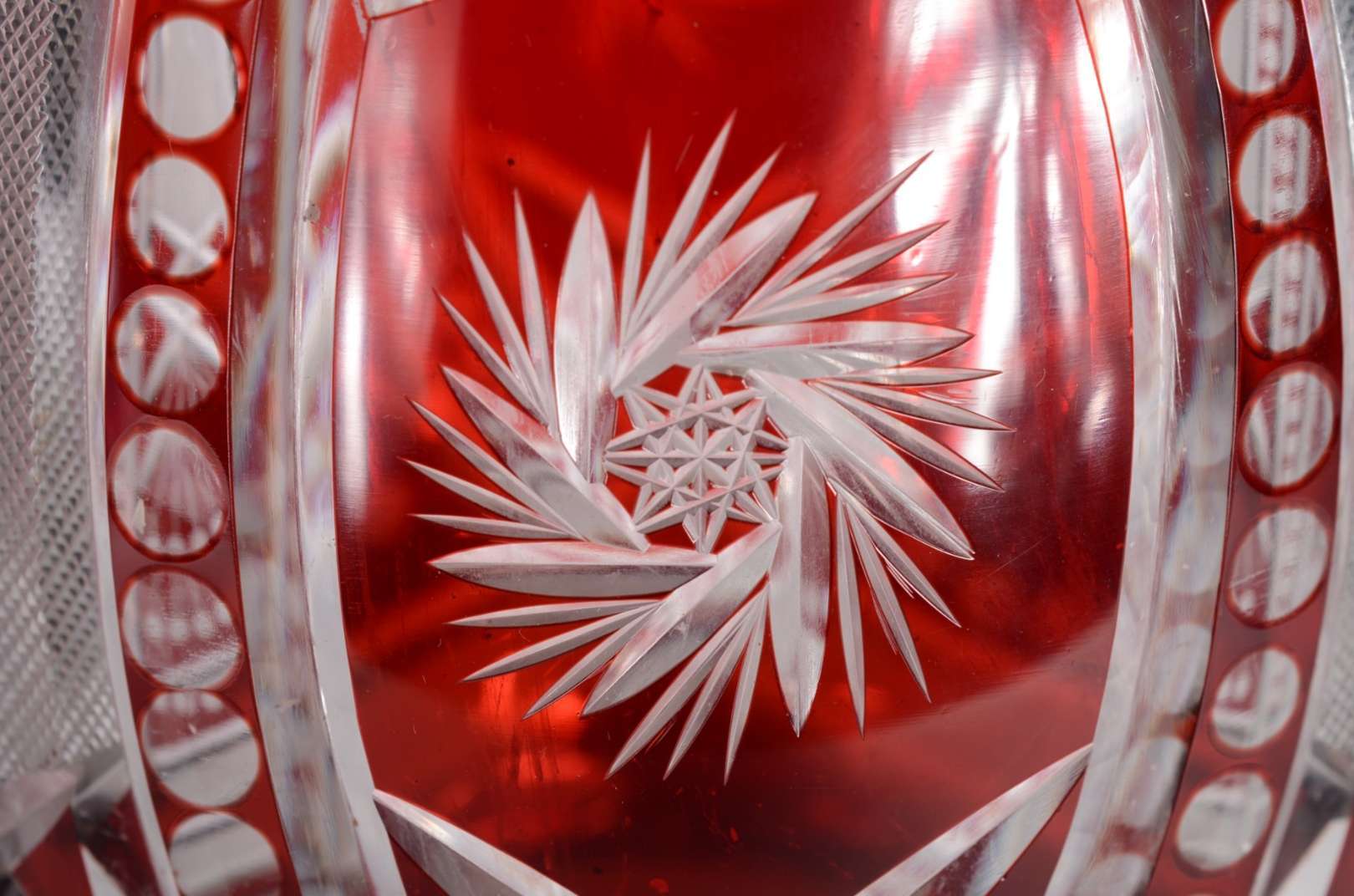Conjunto de licoreira com 6 cálices e presentoir de cristal europeu doublé rubi lapidado. Pequenos lascados no presen...