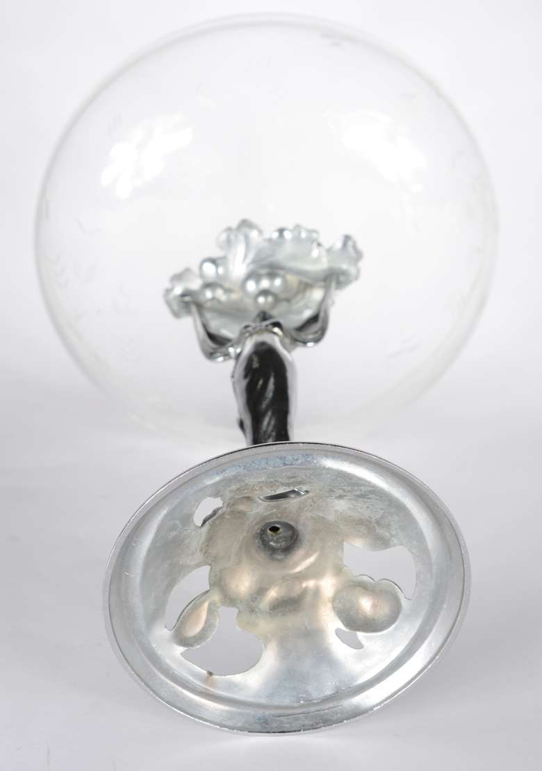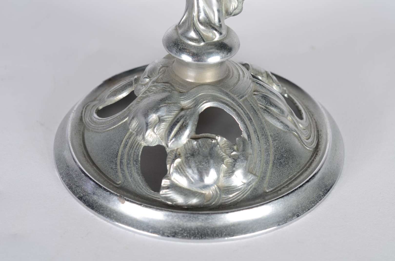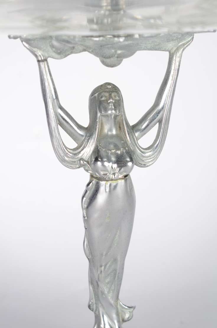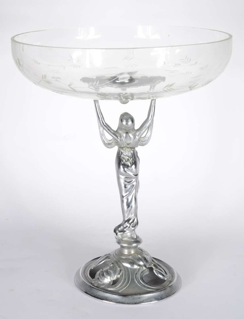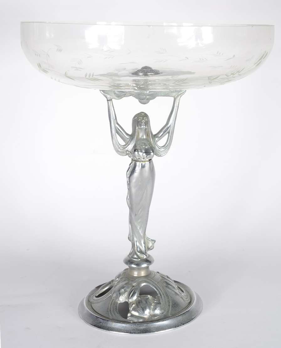 Fruteira/centro de mesa de cristal lapidado, base de bronze decorada com figuras de anjos.