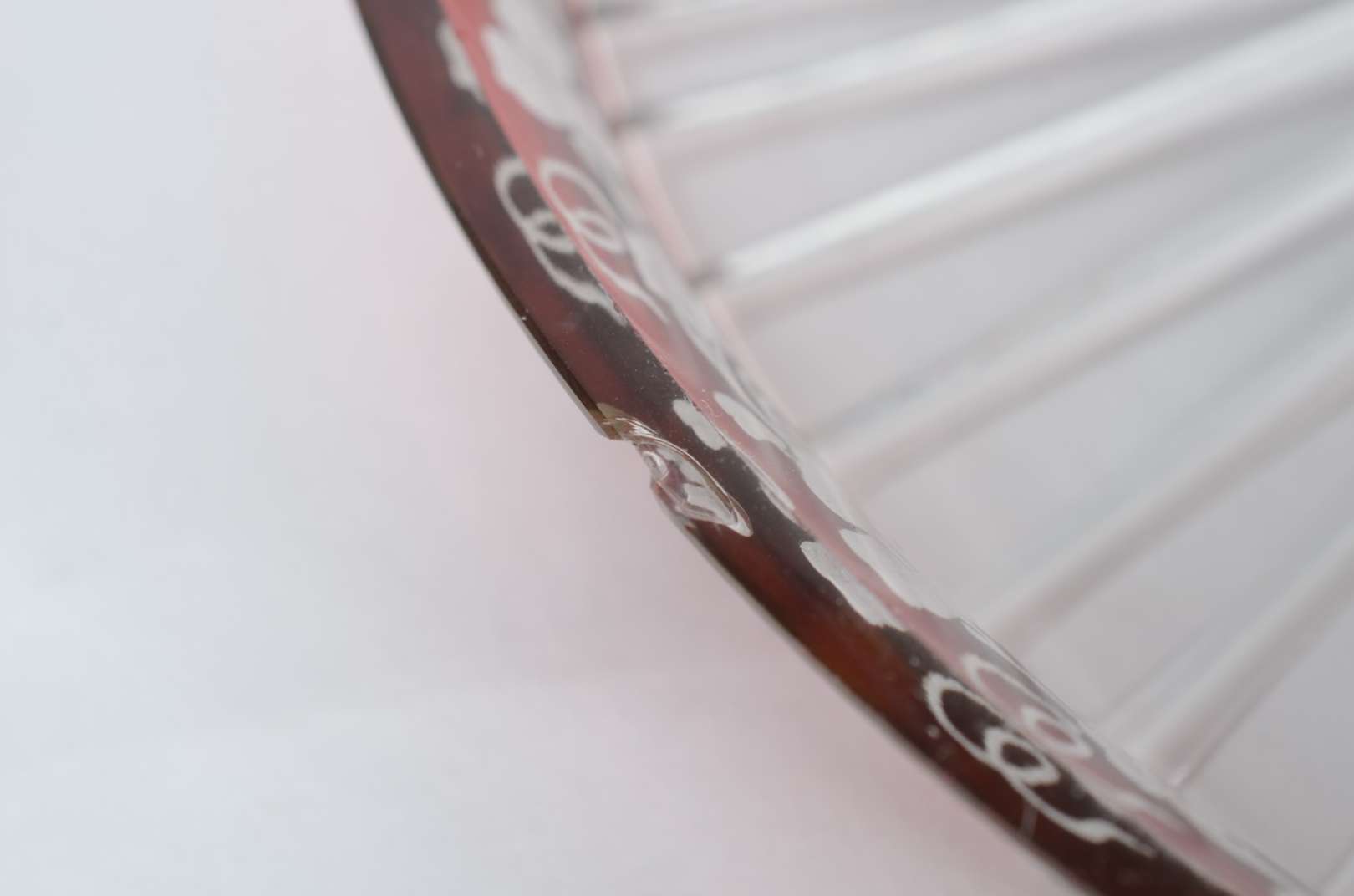 Fruteira com base de metal estilo Art Noveau, representando figura feminina e prato de cristal. Lascado no furo central.