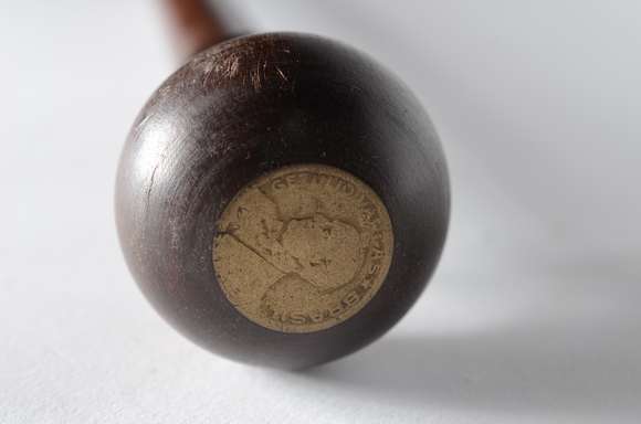 Bengala de madeira nobre, castão com moeda com figura de Getúlio Vargas.