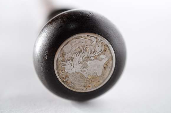 Bengala de madeira nobre, castão com moeda.