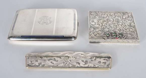 Três peças de prata de lei, sendo: cigarreira, poseira e porta pente. Peso da prata: 120 g. (Por motivos de segurança...