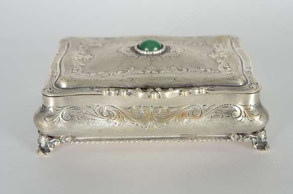 Caixa/porta jóias de prata, contraste 800 mls, tampa com pedra verde cabochon. Peso da prata: 350 g. (Por motivos de...