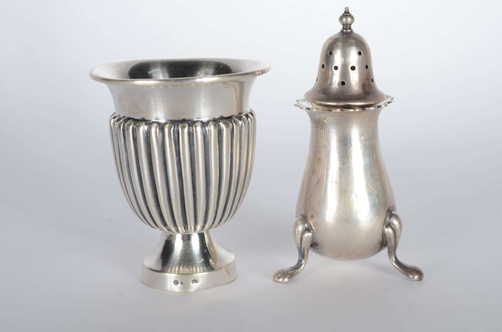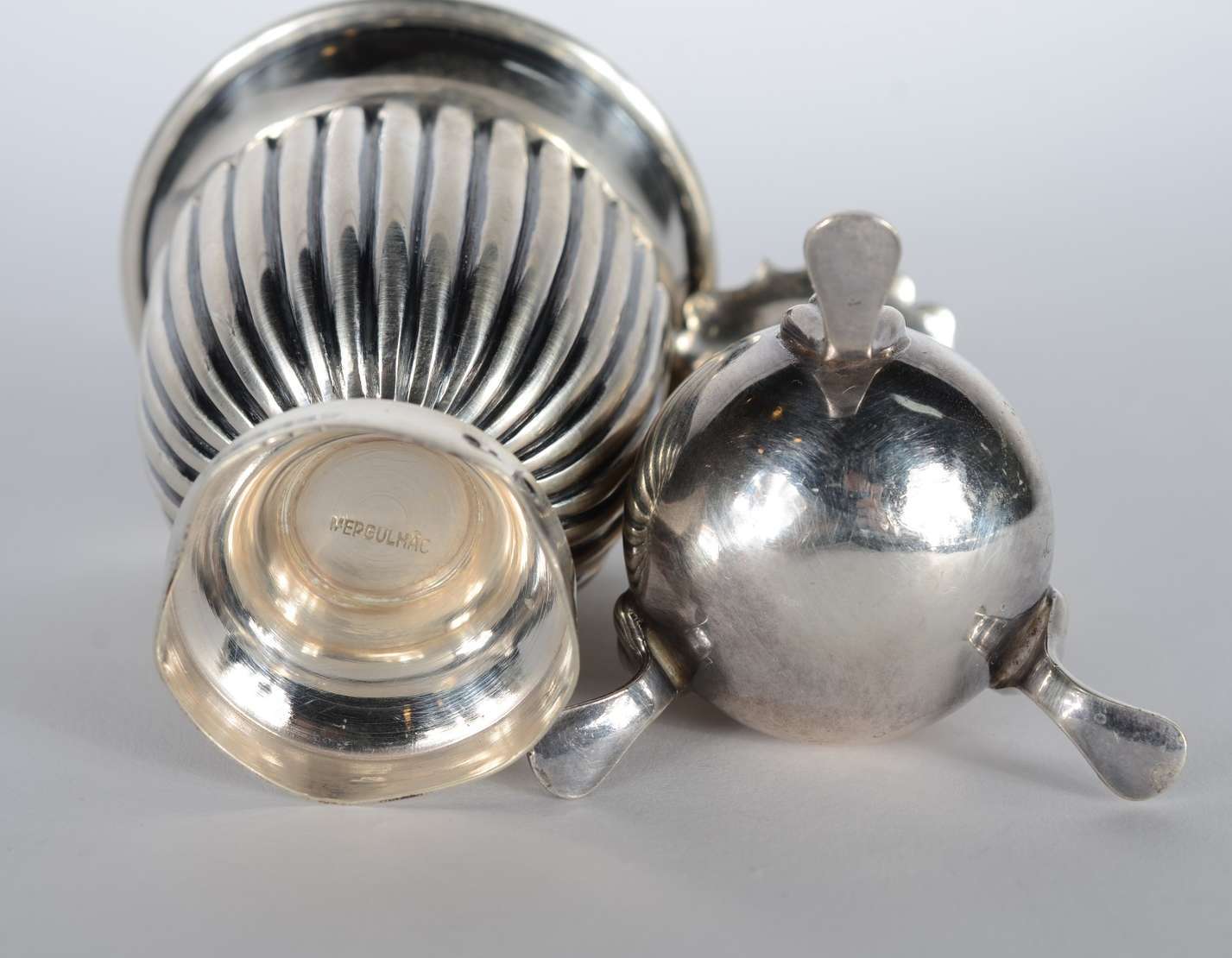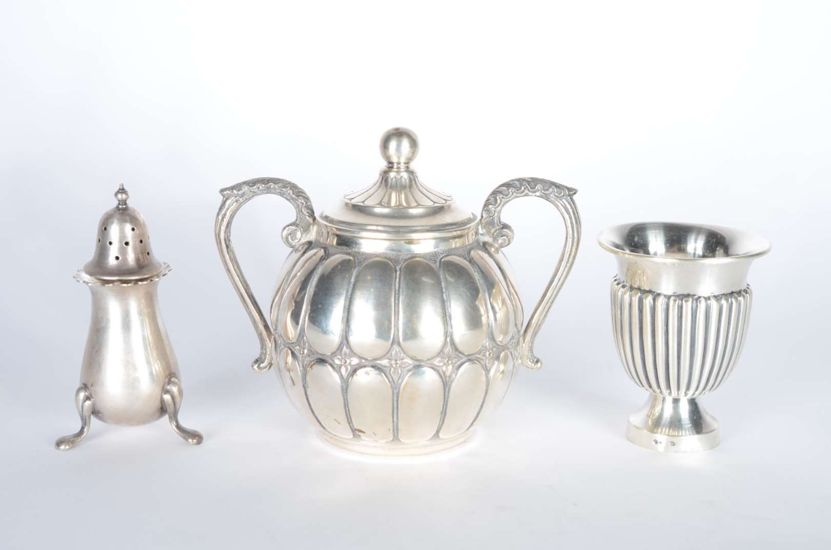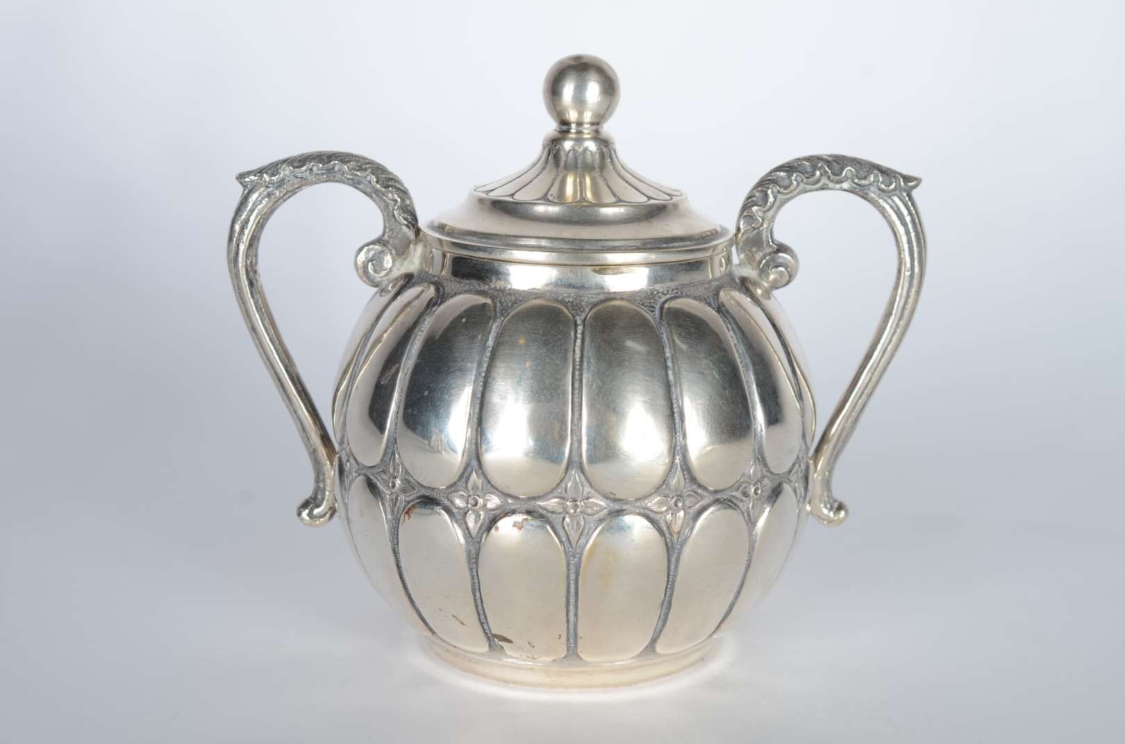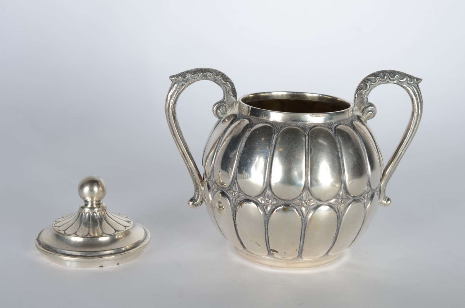 Samovar de metal espessurado a prata com guirlandas cinzeladas, pega da tampa na forma de fruto, pés em concheados. P...