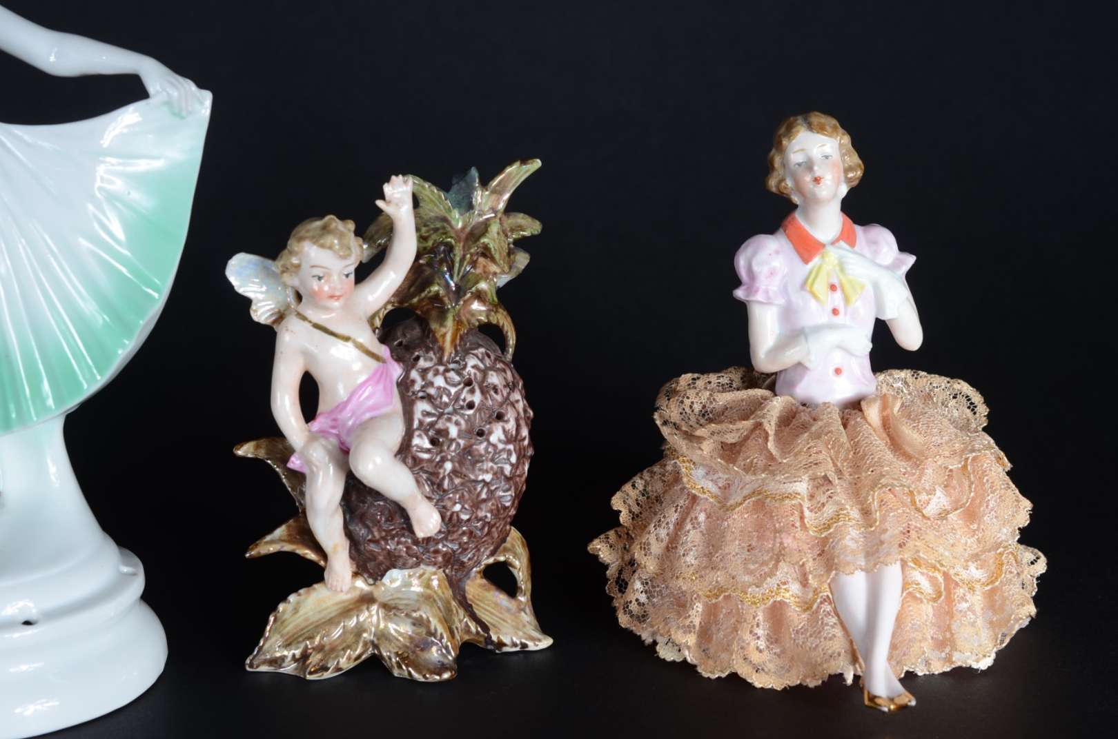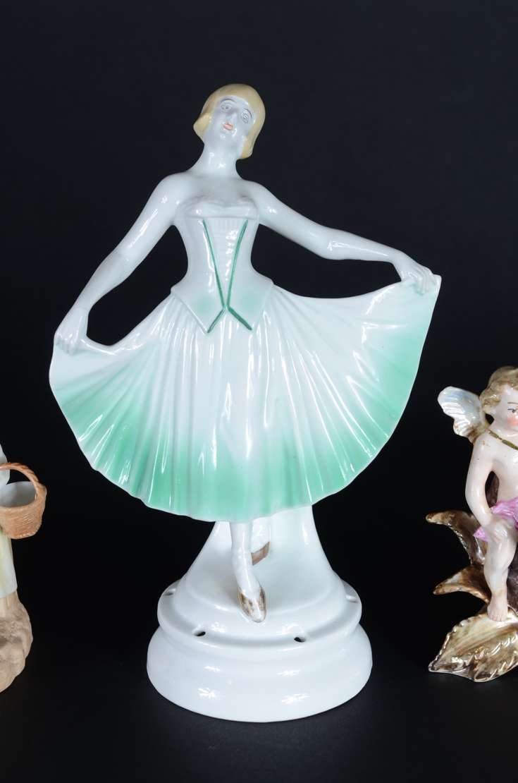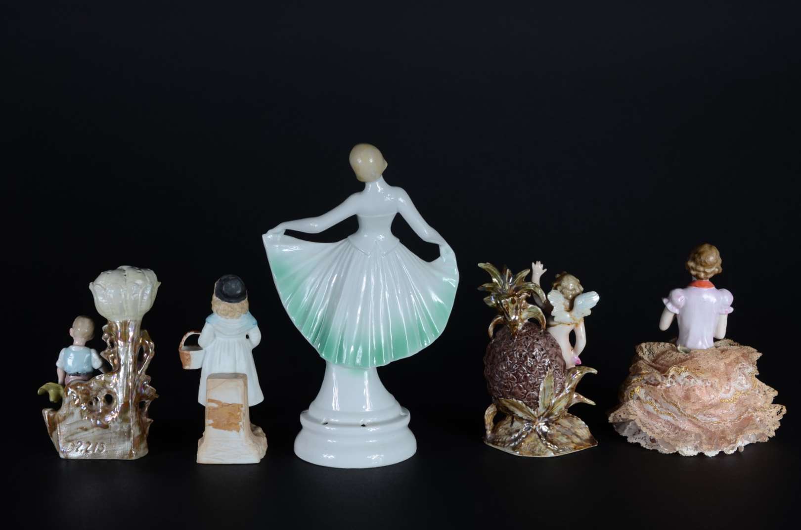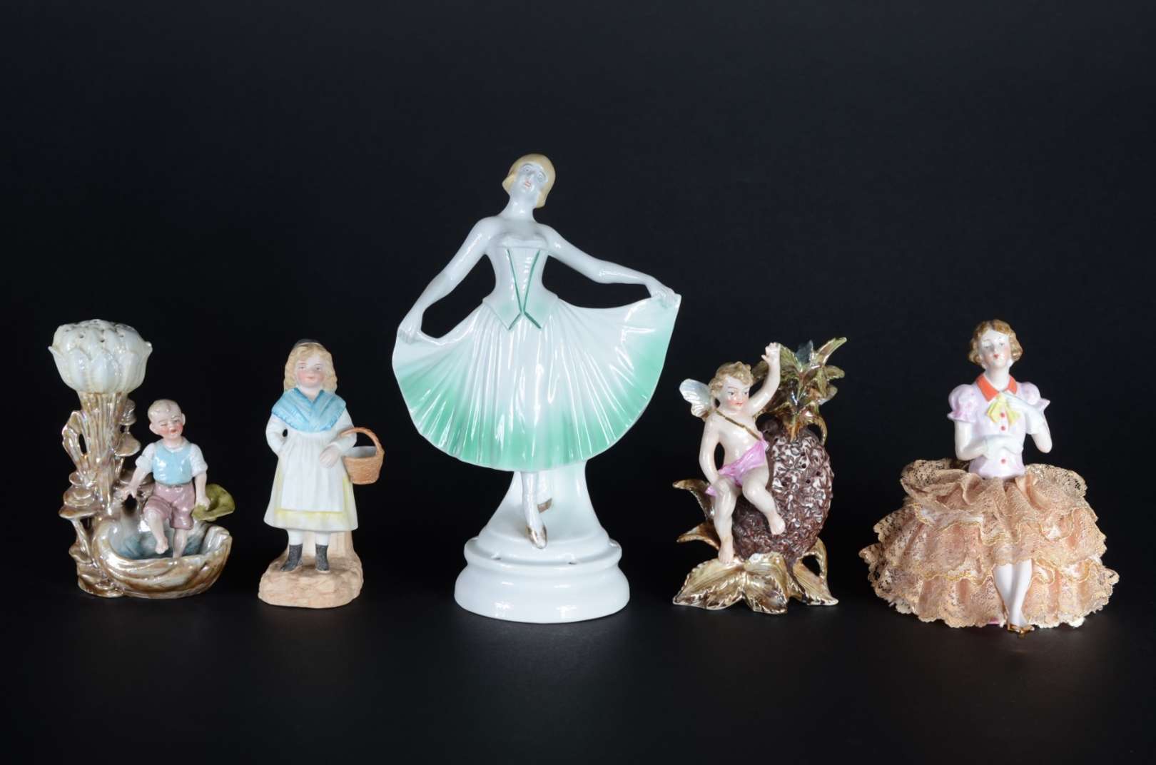 Cinco pequenas peças de porcelana, sendo: 2 paliteiros (uma asa colada) e 3 estatuetas representando figuras femininas (uma com fio de cabelo).
