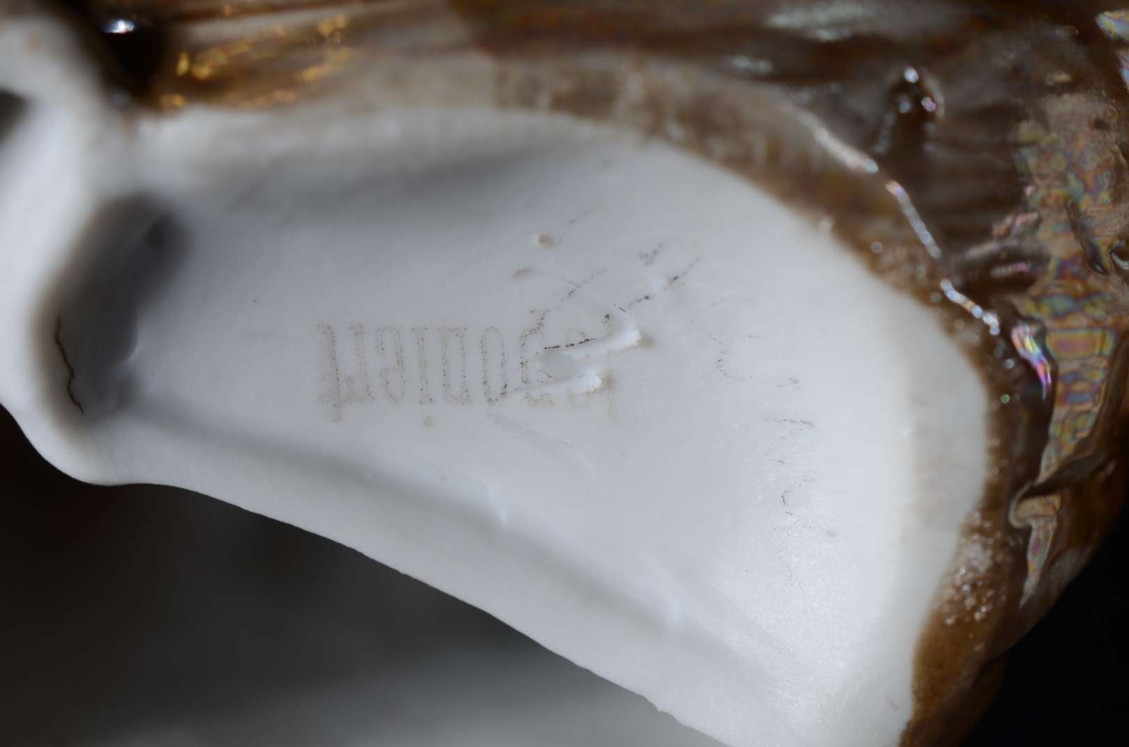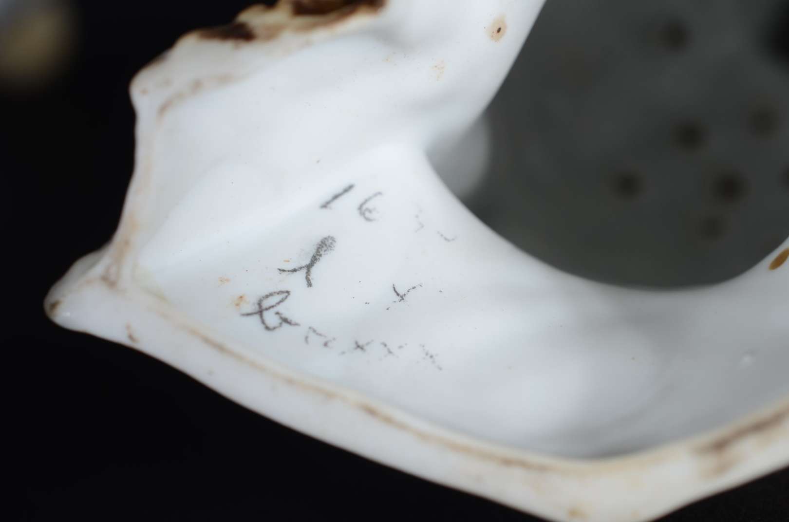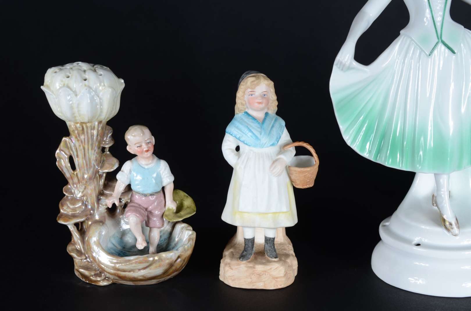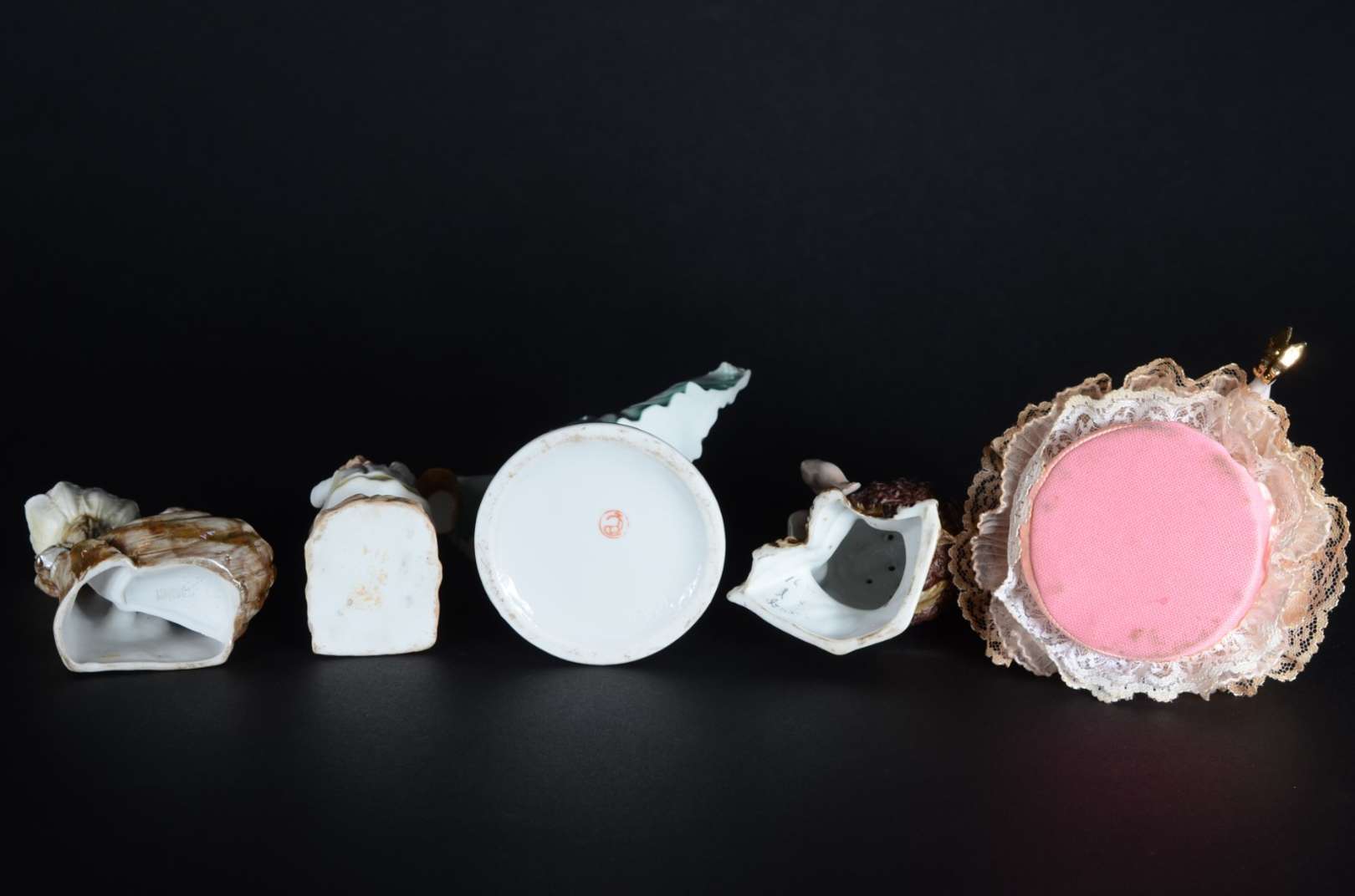 Cinco pequenas peças de porcelana, sendo: 2 paliteiros (uma asa colada) e 3 estatuetas representando figuras femininas (uma com fio de cabelo).