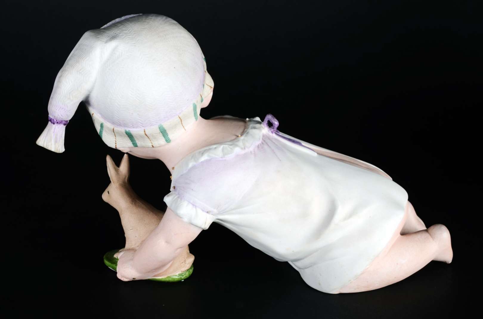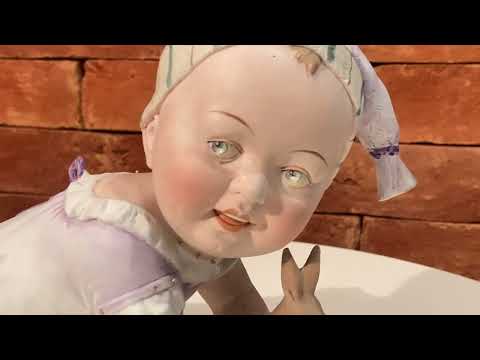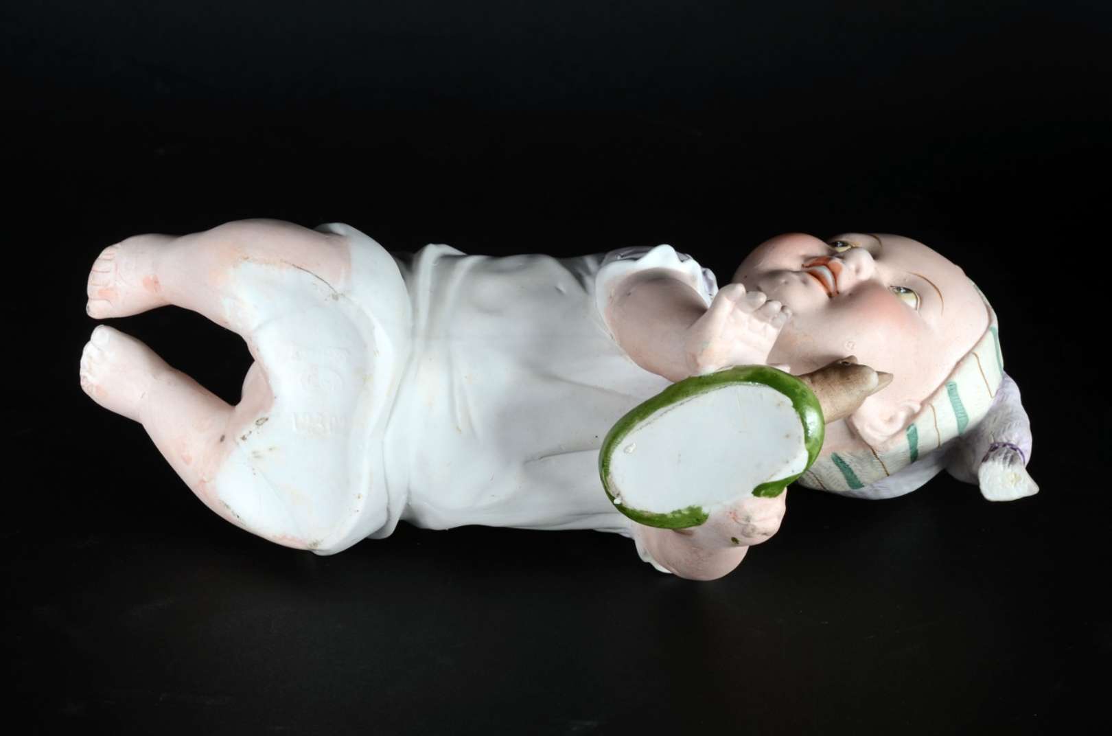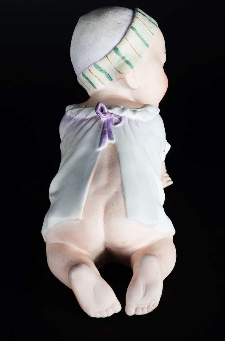 PIANO BABY - Escultura em biscuit alemão policromado, século XIX, representando "criança tirando a meia". Marcada e n...
