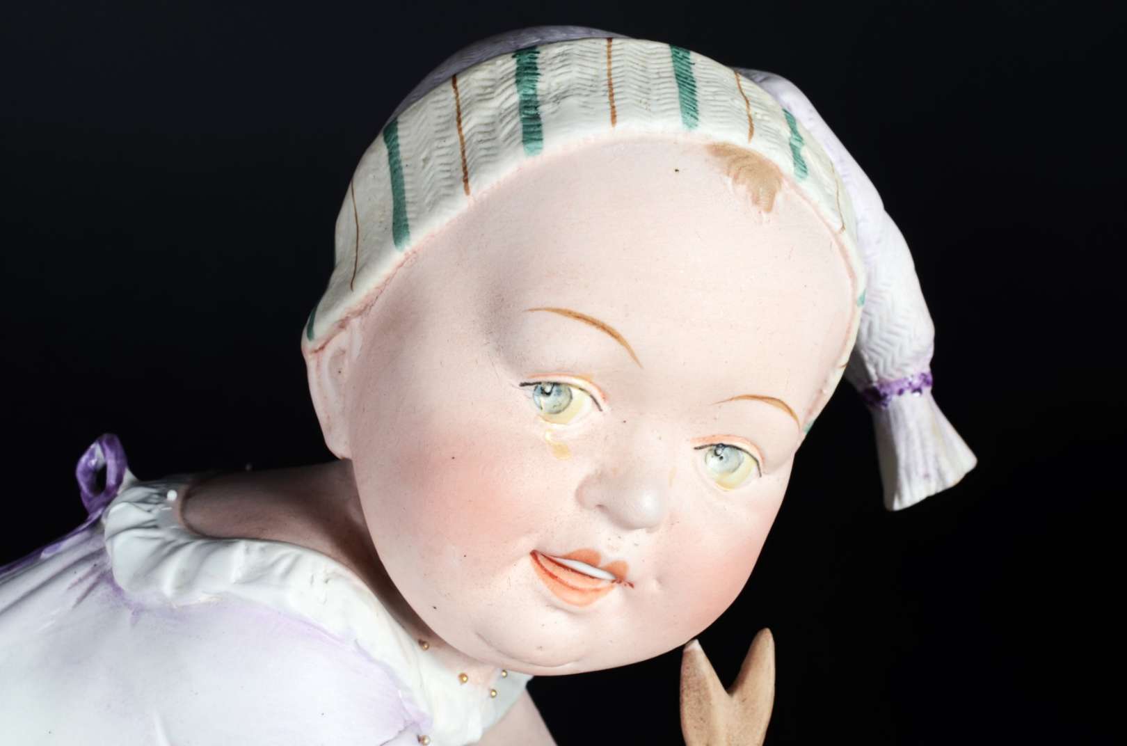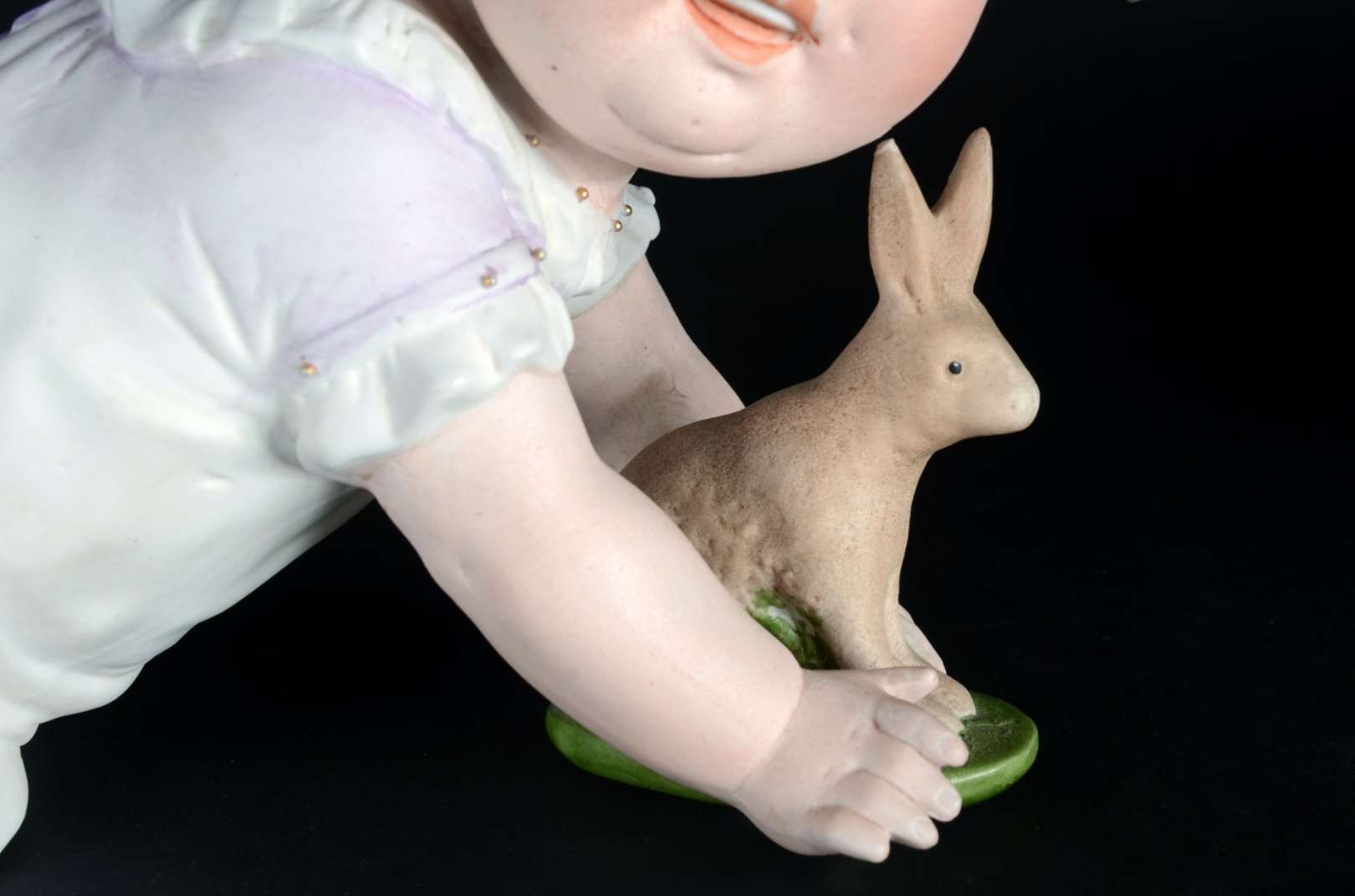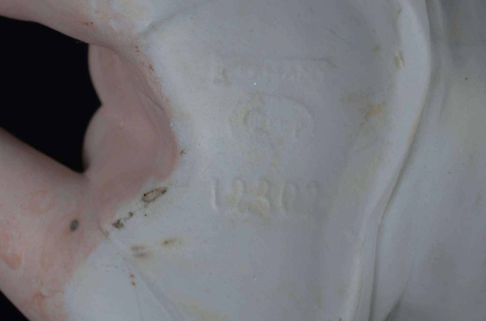 PIANO BABY - Escultura em biscuit alemão policromado, século XIX, representando "criança tirando a meia". Marcada e n...