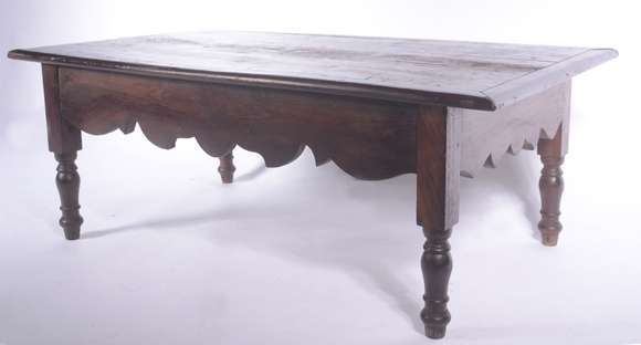 Mesa de centro de madeira nobre, tampo retangular com saia recortada apoiado em 4 pernas torneadas.
