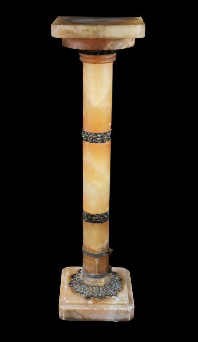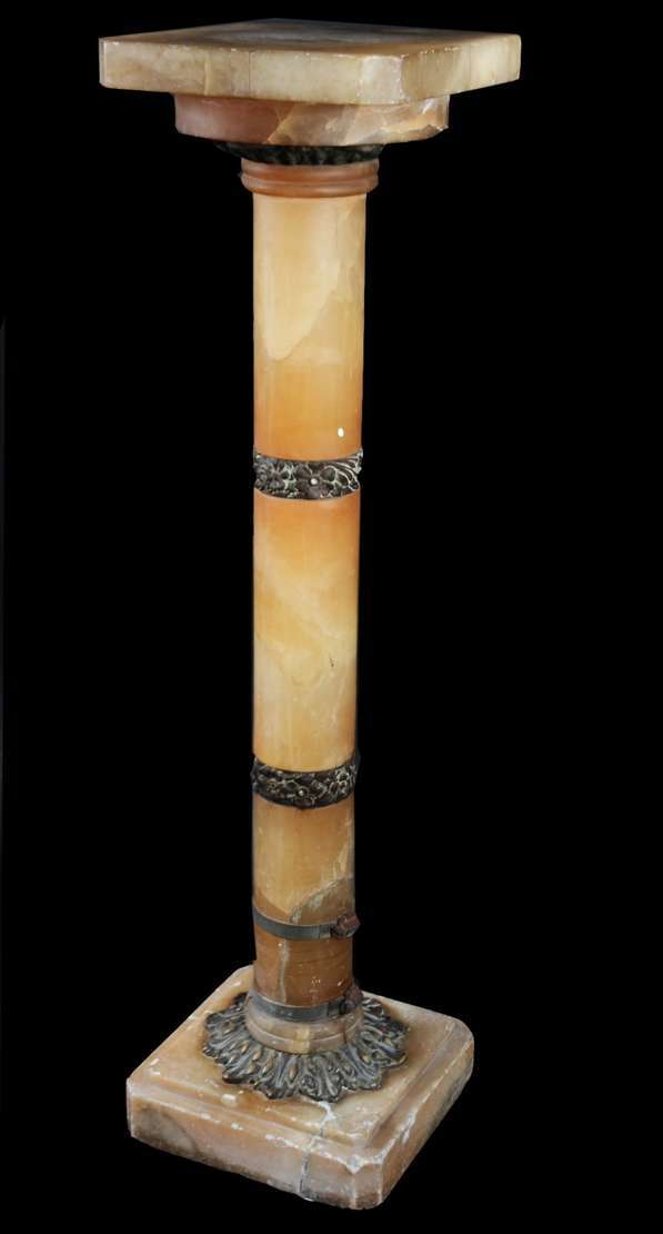 Duas colunas orientais de madeira pintada de preto, saias com entalhes florais na cor rouge de fer, tampos quadrangul...