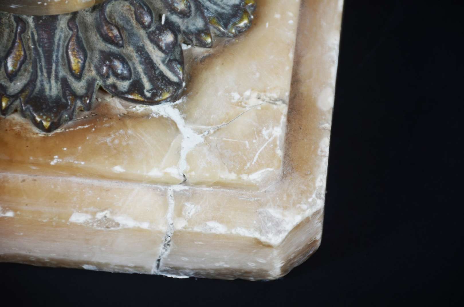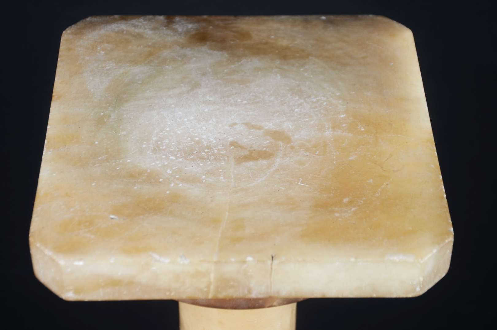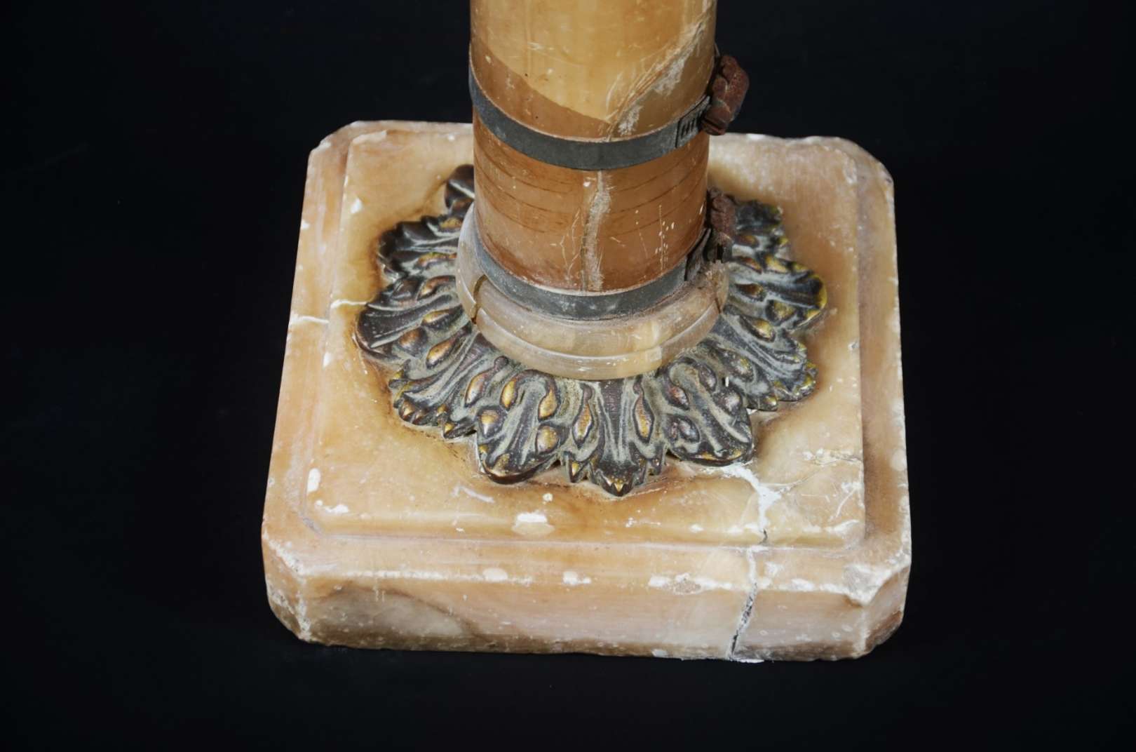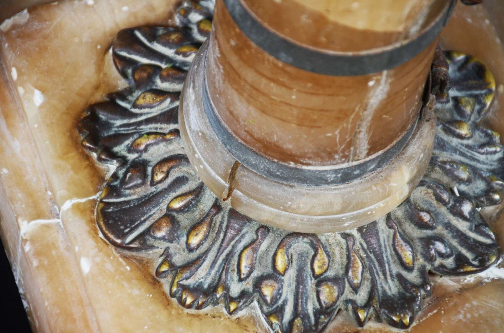 Mesa de bar em madeira com pés de metal e tampo de mármore. Mármore lascado na quina.