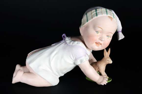 PIANO BABY - Escultura em biscuit alemão policromado, século XIX, representando "criança com brinquedo". Marcada e nu...