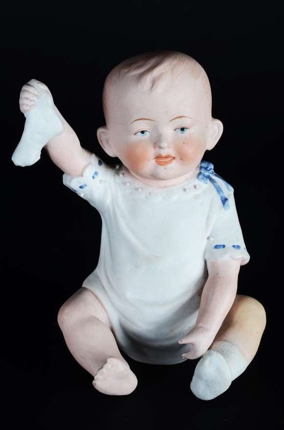 PIANO BABY - Escultura em biscuit alemão policromado, século XIX, representando "criança tirando a meia". Marcada e n...