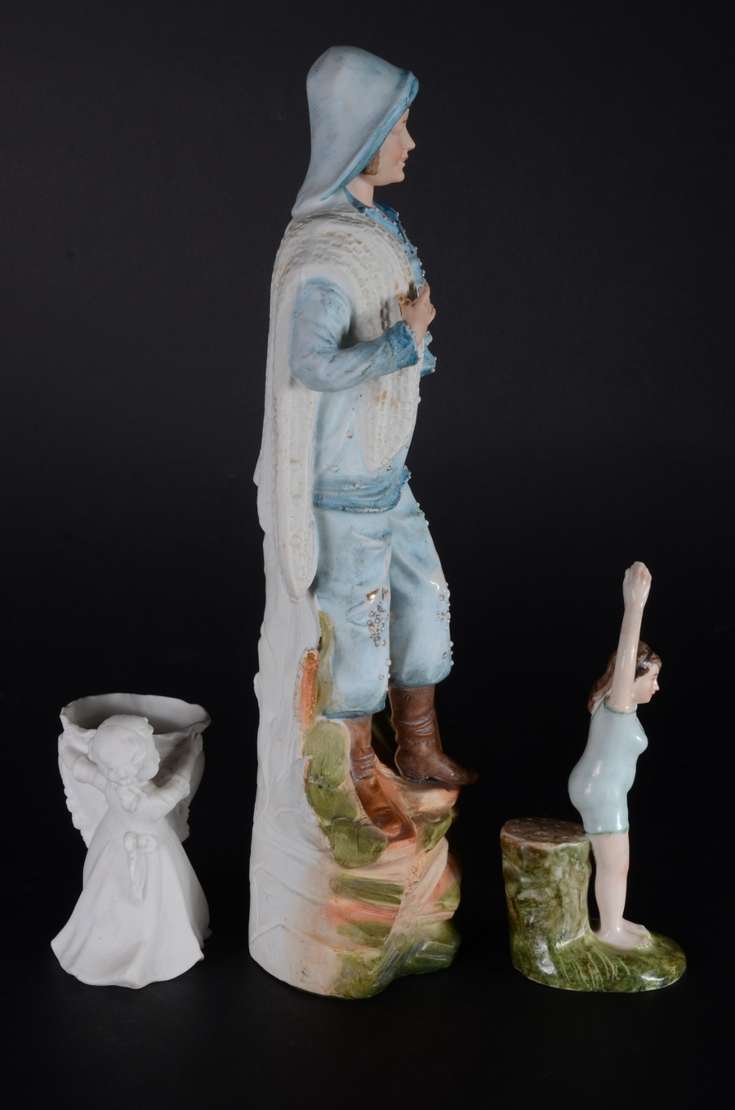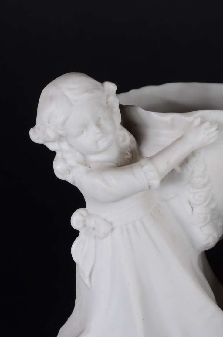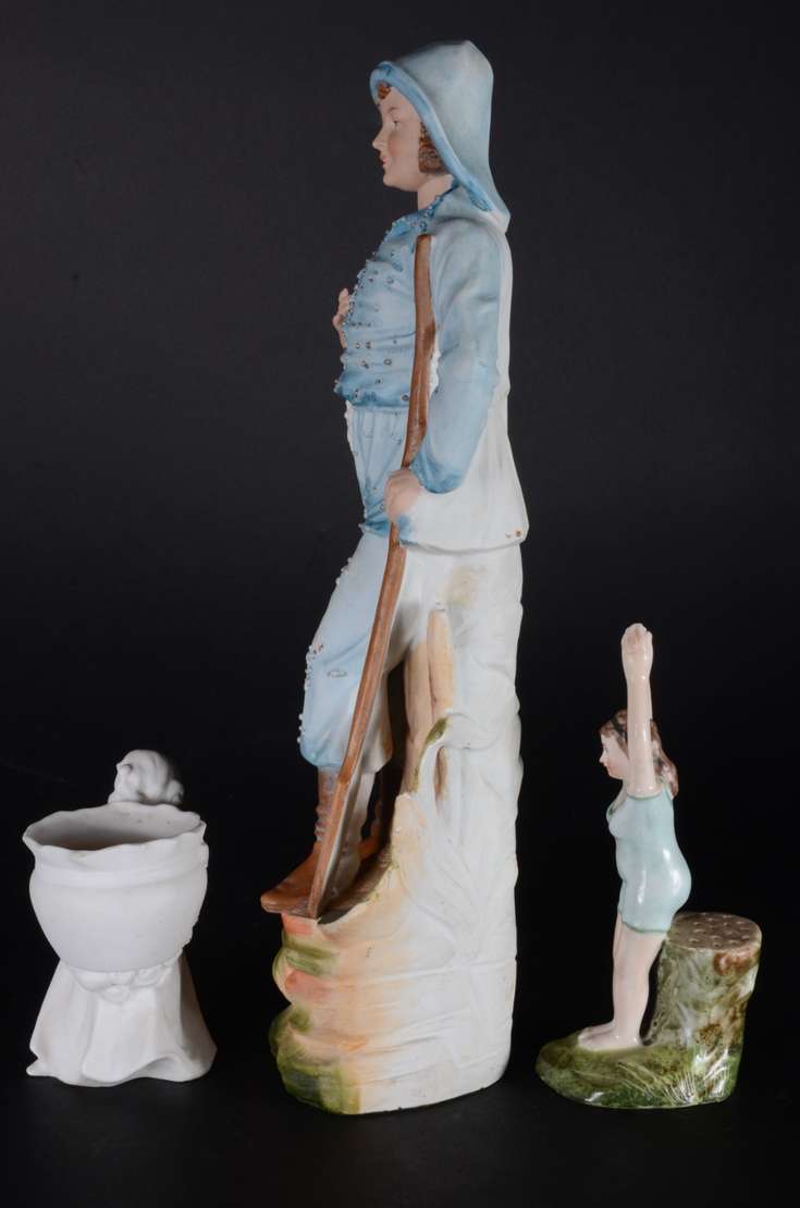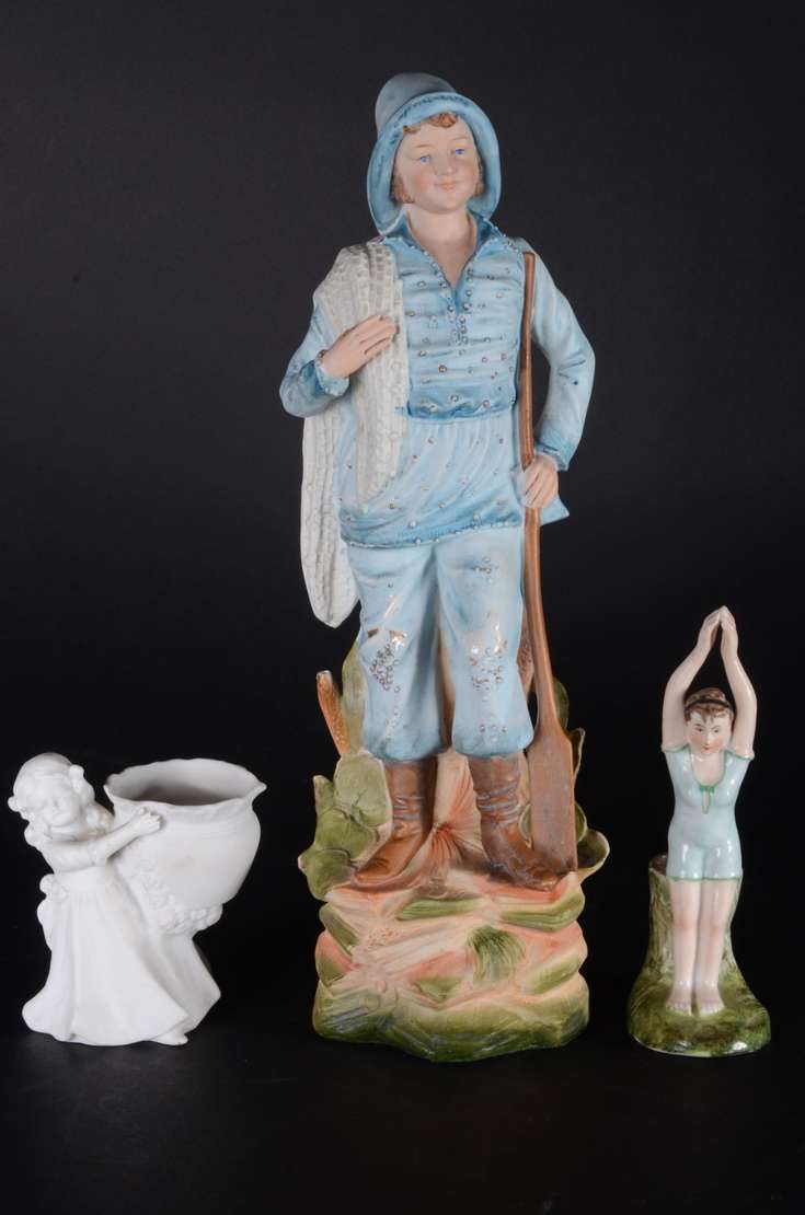 PIANO BABY - Escultura em biscuit alemão policromado, século XIX, representando "criança com brinquedo". Marcada e nu...