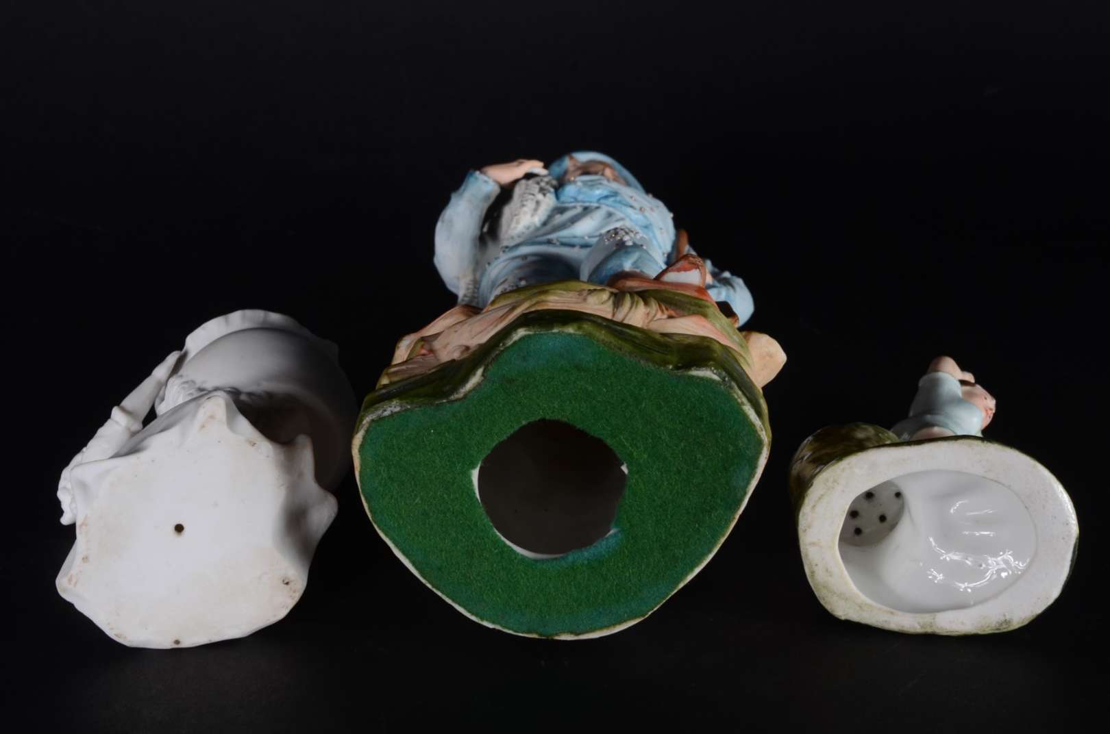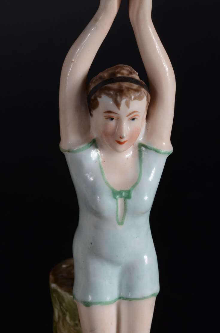 PIANO BABY - Escultura em biscuit alemão policromado, século XIX, representando "criança tirando a meia". Marcada e n...