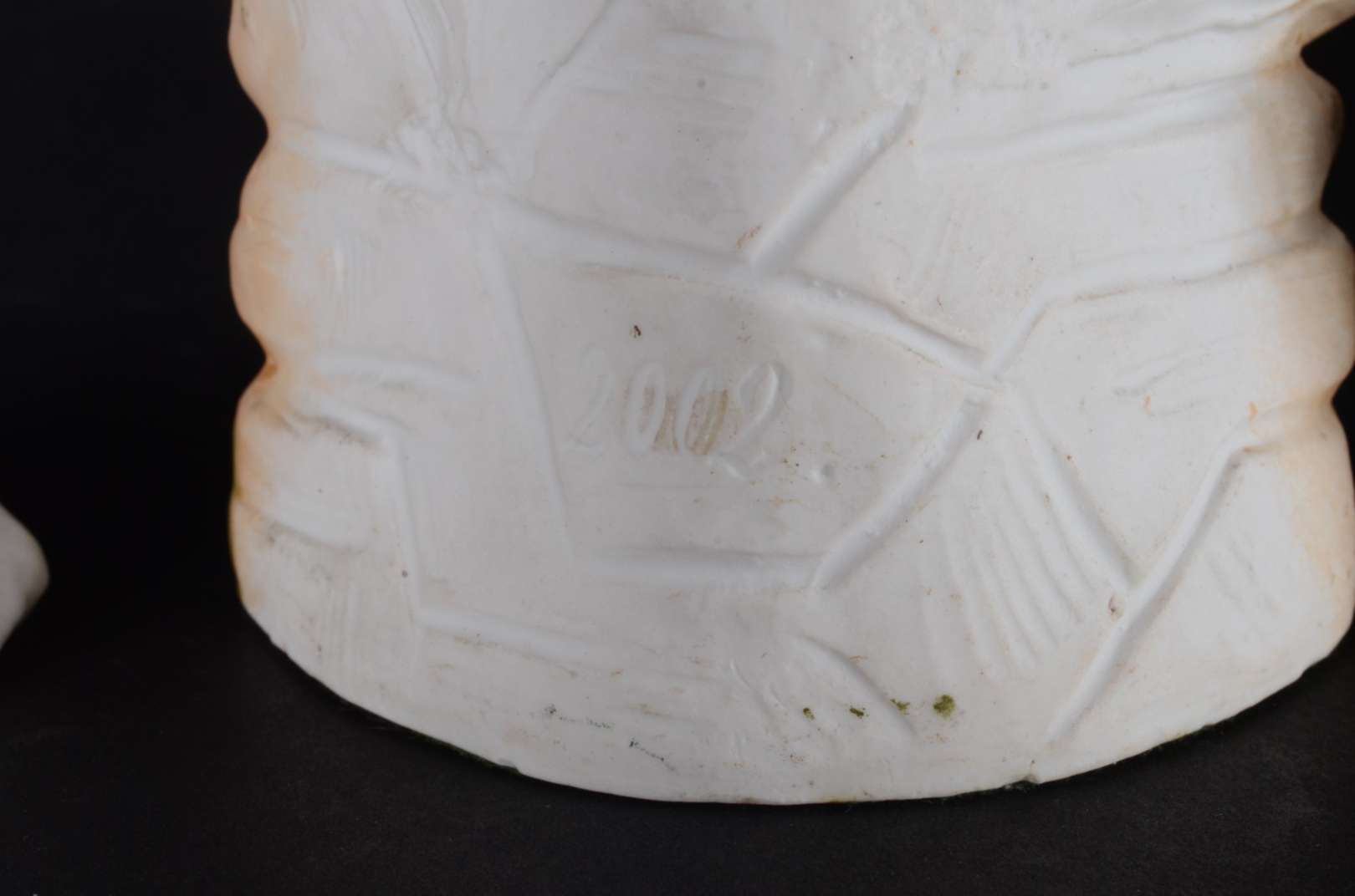Placa de biscuit policromada decorada com figura masculina e figura de criança em relevo.