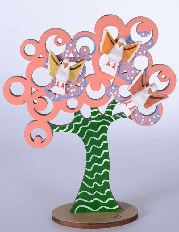 Arvore de madeira pintada com "Divino". Parte do acervo da loja "Em Uso"