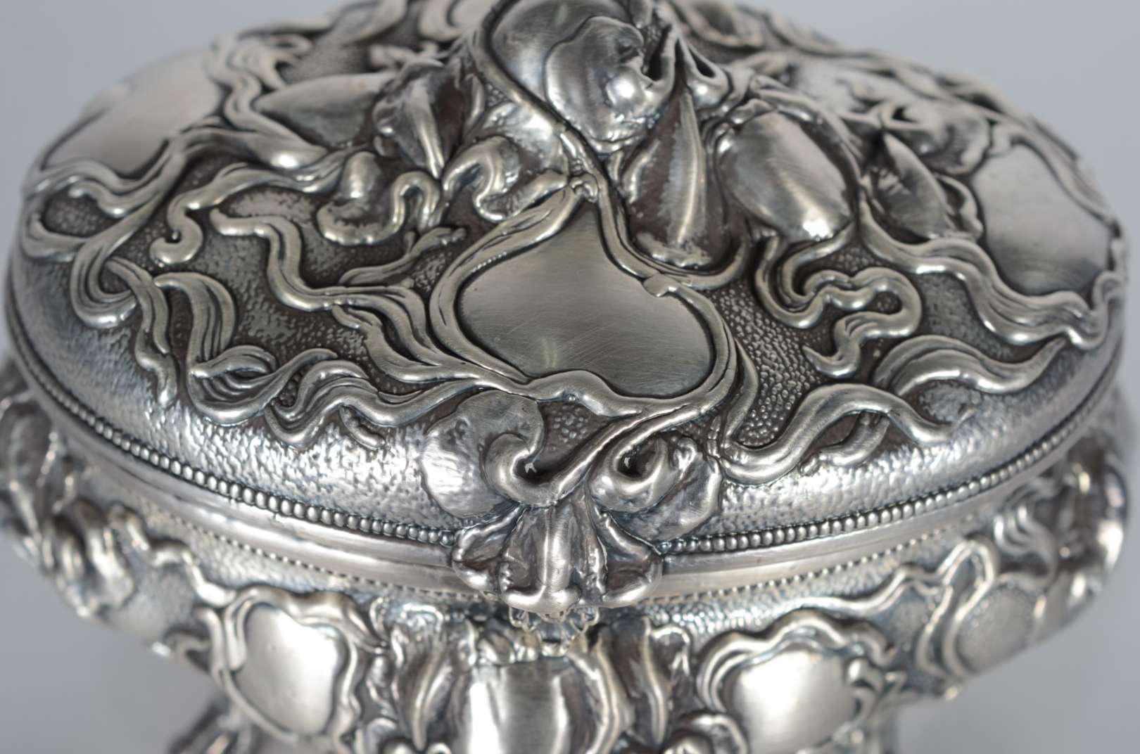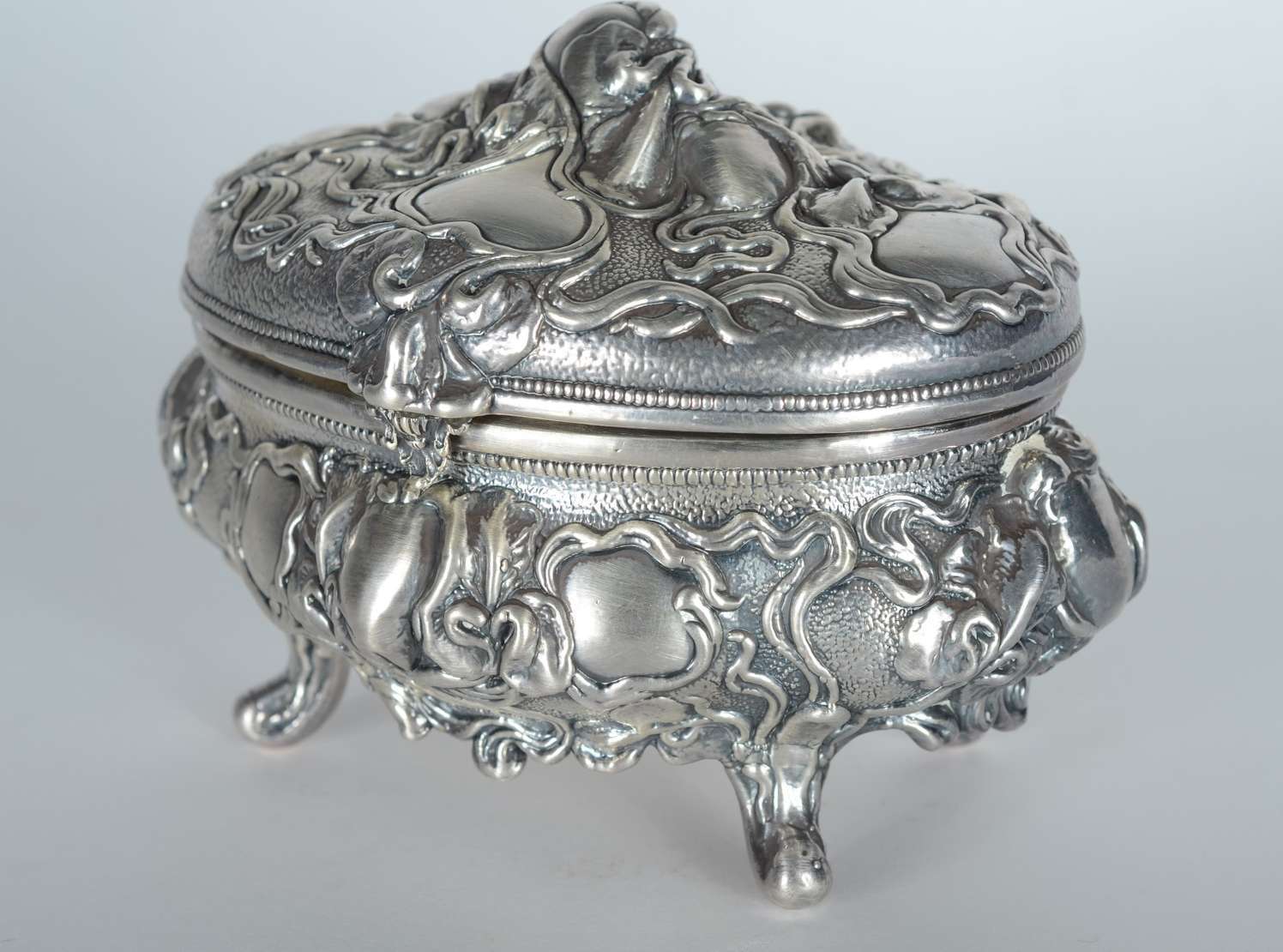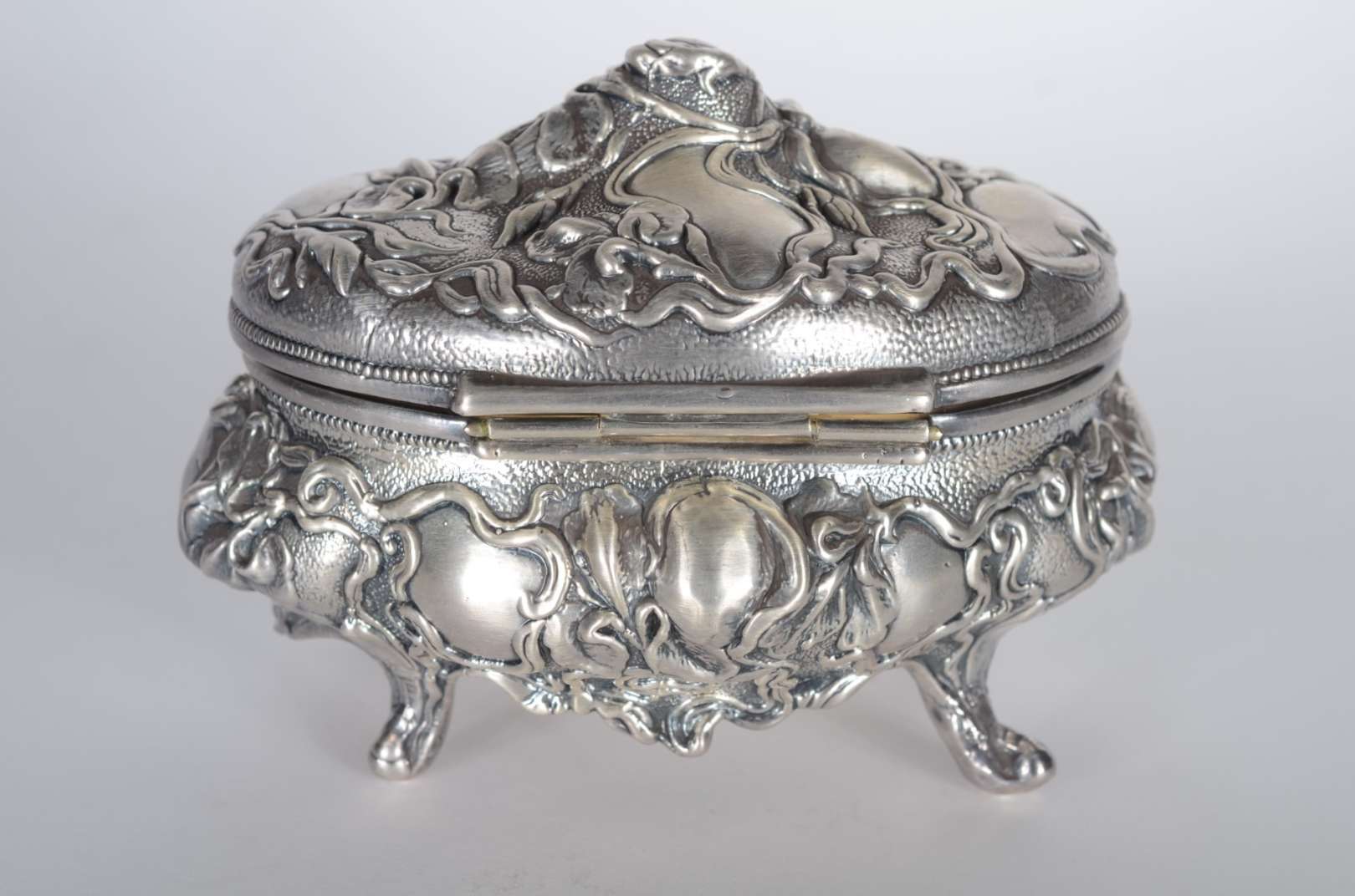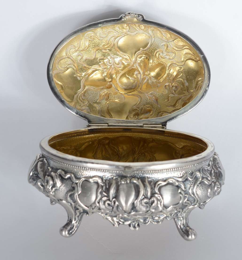 Três peças diversas, sendo: porta bloco de madeira e prata, espelho de bolsa com placa Limoges e caixa filigranada pa...