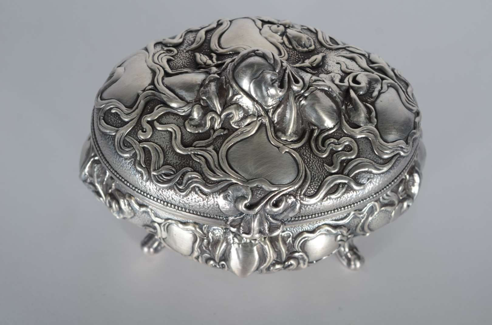 Espelho de cristal bisotado, feitio oval, moldura entalhada e dourada encimada por ânfora com flores entalhadas e lad...