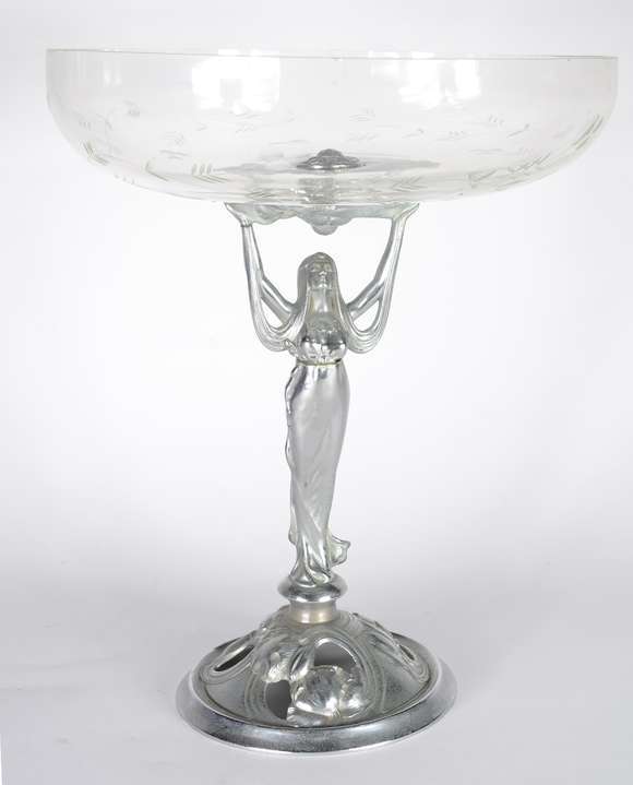 Fruteira com base de metal estilo Art Noveau, representando figura feminina e prato de cristal. Lascado no furo central.