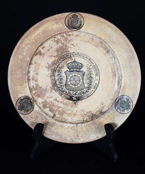 Prato de faiança "Anthony Shaw & Son". Ao centro brasão Imperial envolto por jarreteira com a legenda: Corpo Policial...