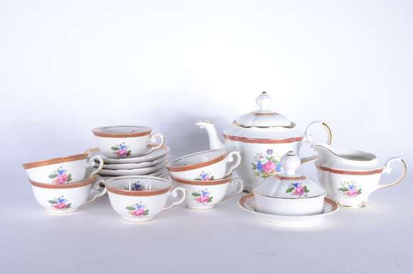 Serviço para chá de porcelana Real, branca decorada com flores em policromia, composto de: 6 xícaras com pires, bule,...