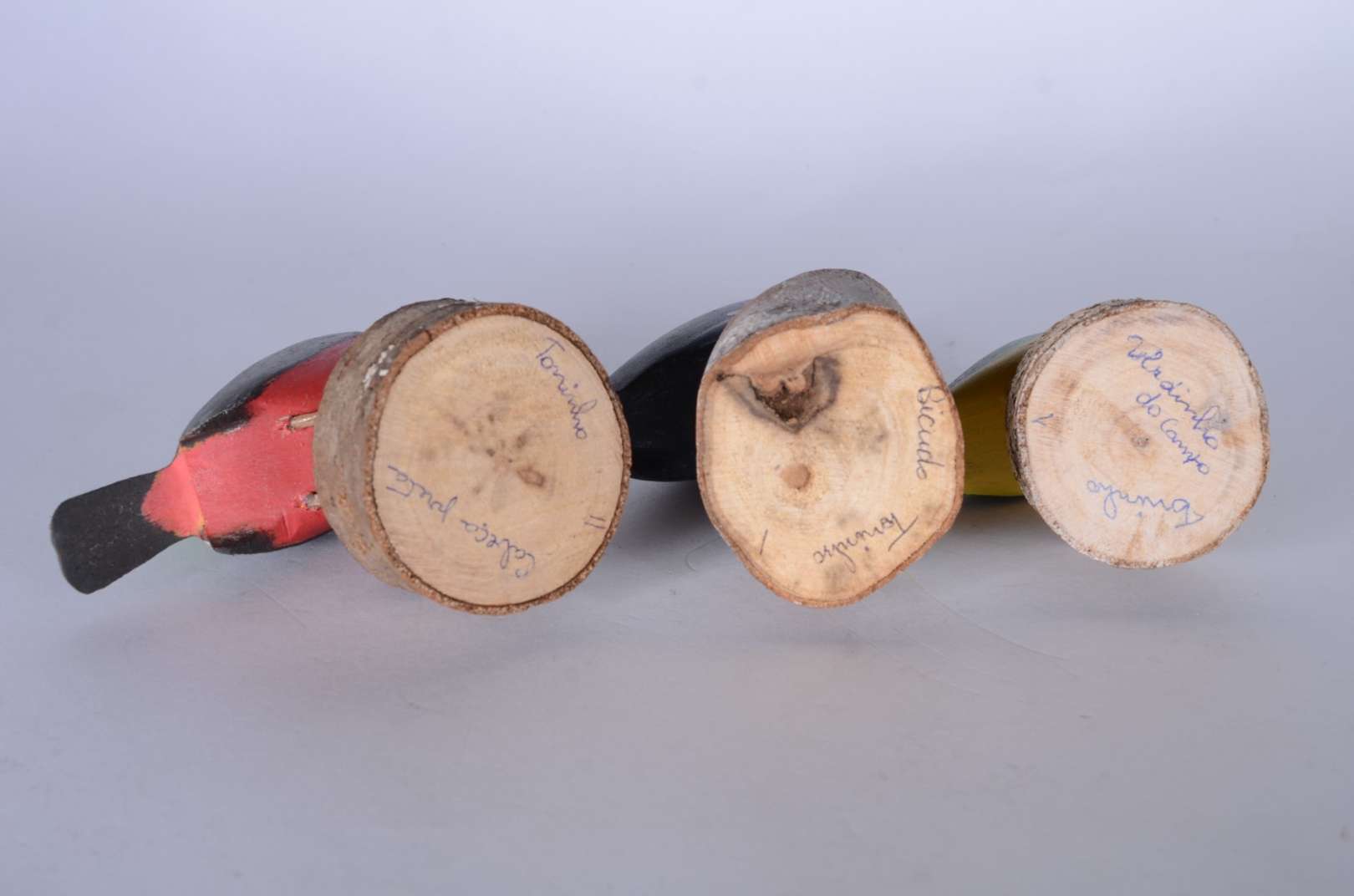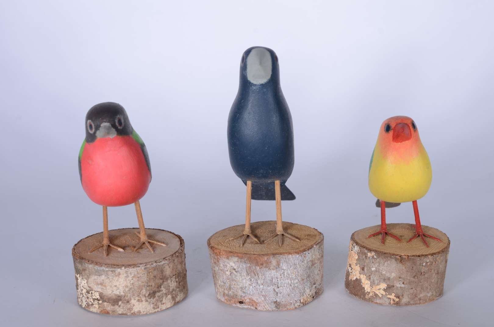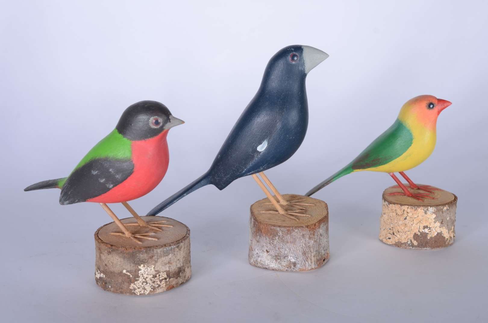 Três esculturas de madeira policromada representando pássaros, sendo: bicudo, verdinho do campo e cabeça preta. Assinadas Toninho. Parte do acervo da loja "Em Uso"
