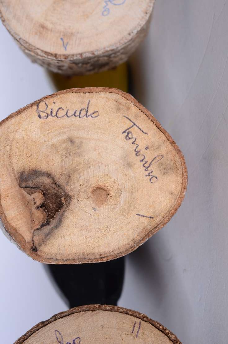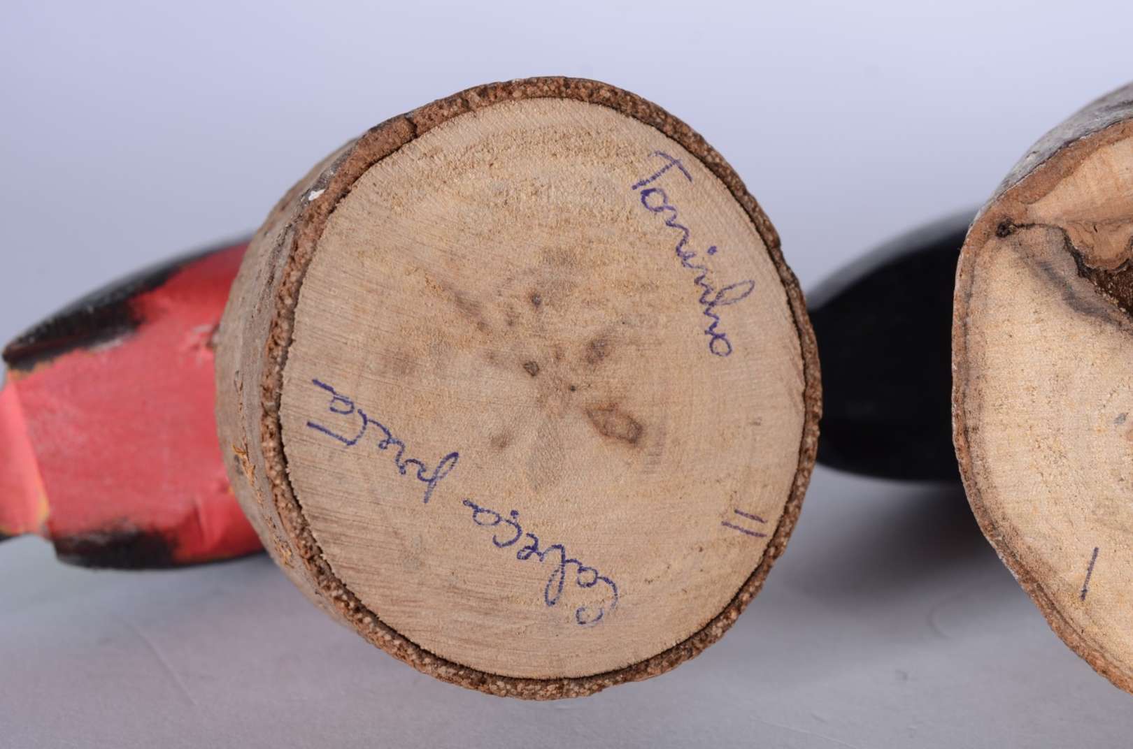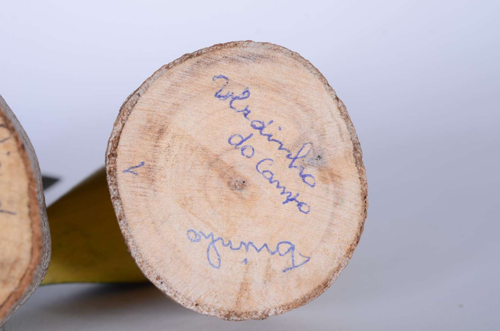 Três esculturas de madeira policromada representando pássaros, sendo: bicudo, verdinho do campo e cabeça preta. Assinadas Toninho. Parte do acervo da loja "Em Uso"