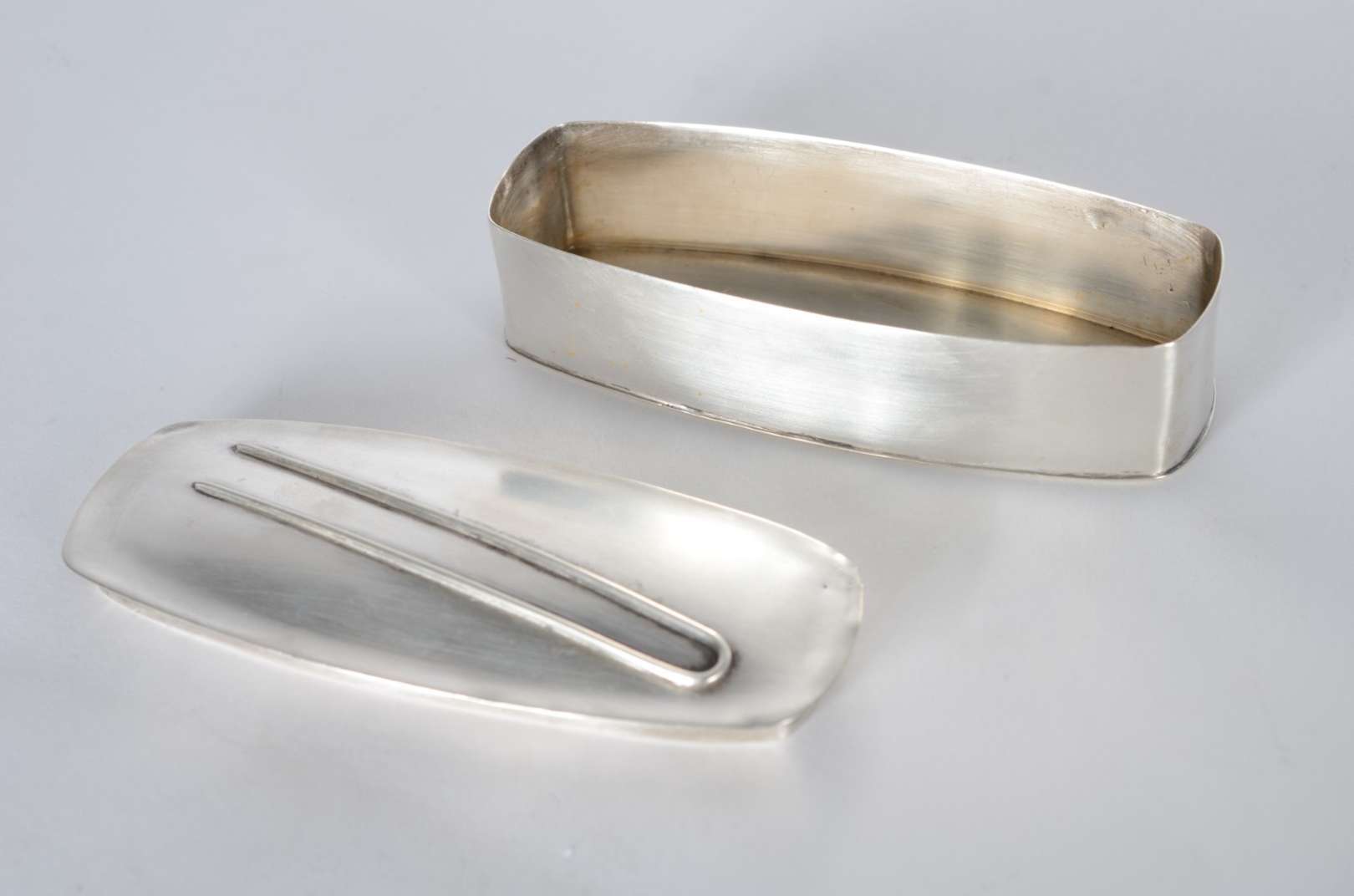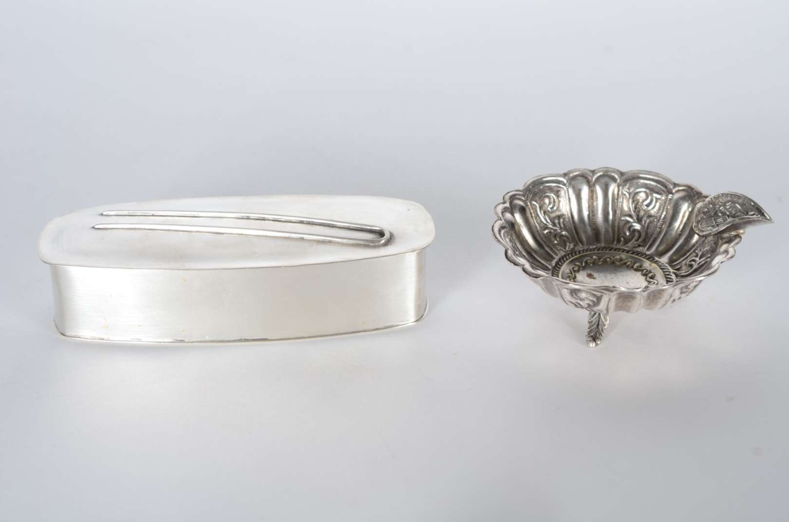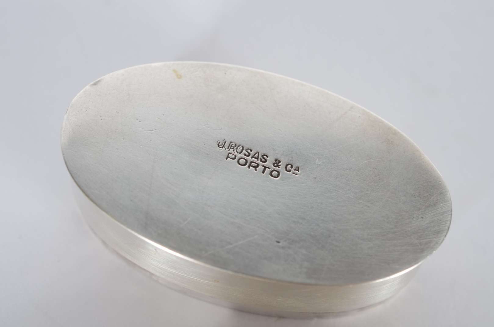 Caixa/ porta jóias de prata contraste 999 mls., feitio oval, trabalhada com guirlandas em relevo, quatro pés recurvos...