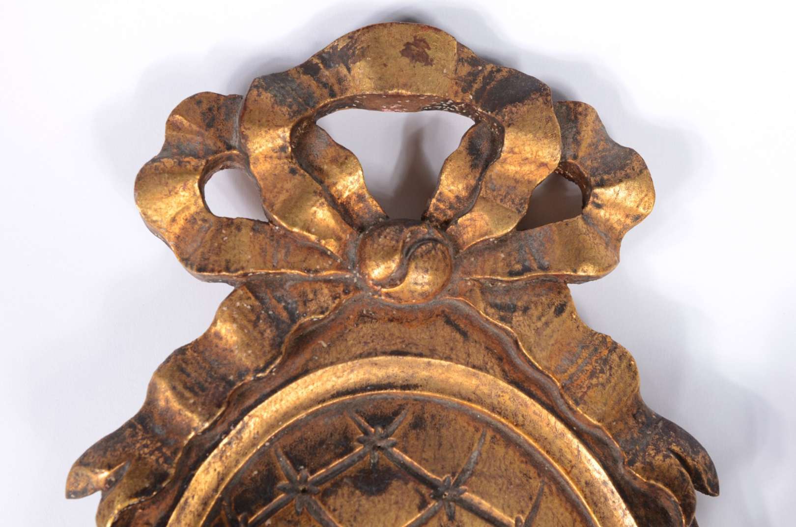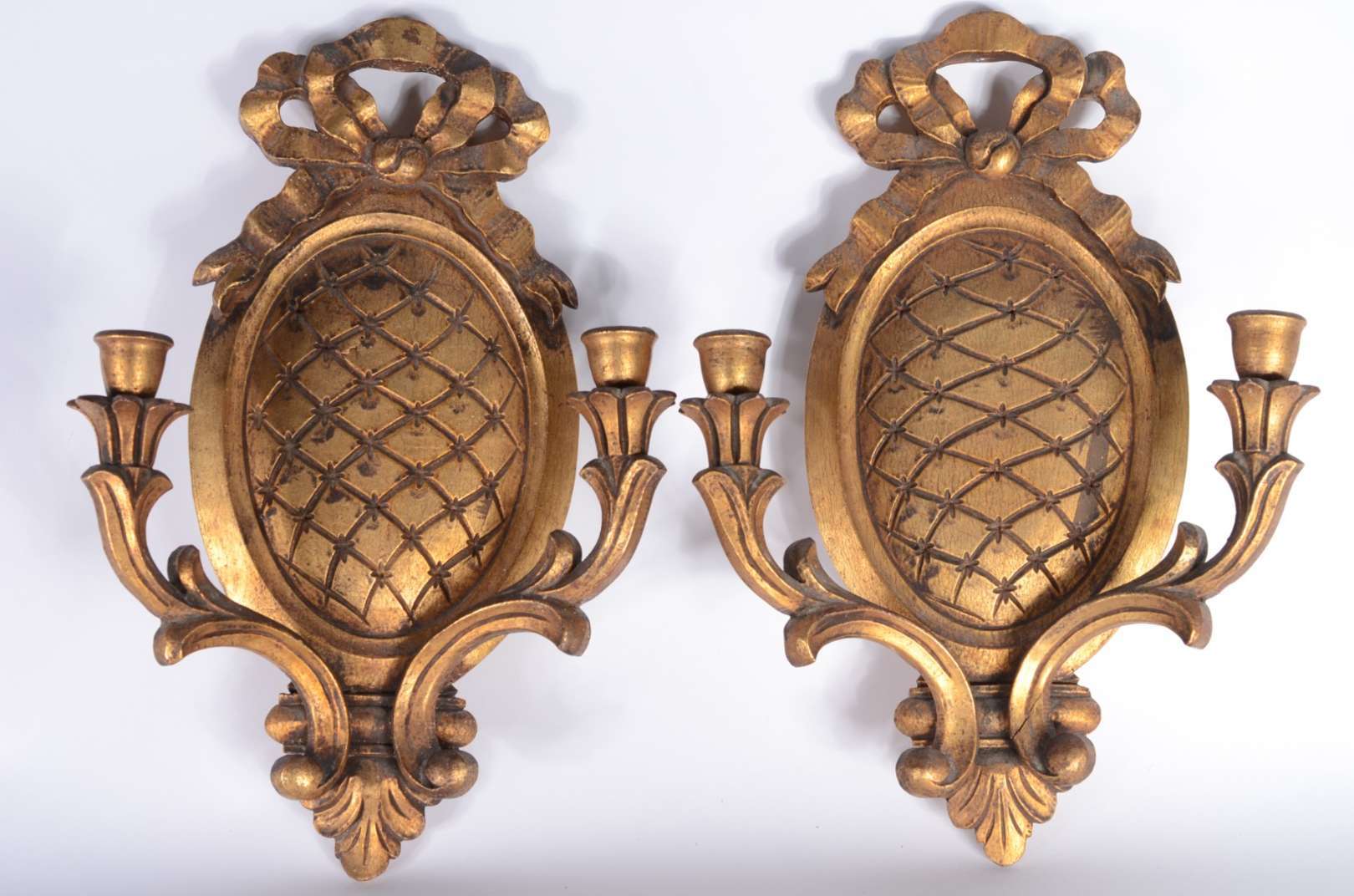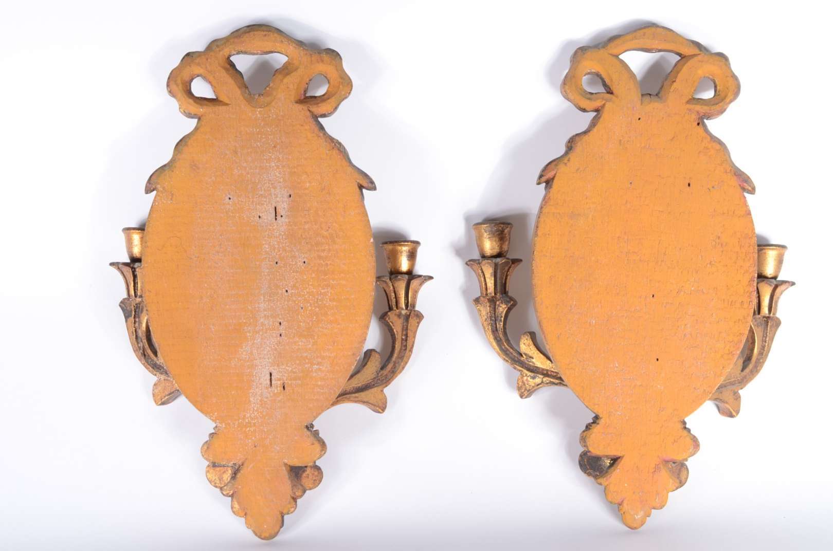 Par de abatjoures de madeira entalhada e patinada, cúpulas de pergaminho. Desgastes.