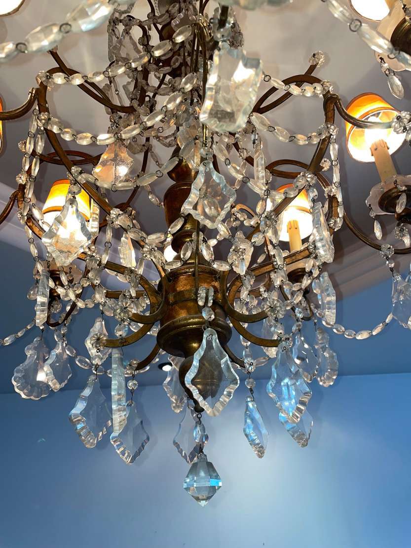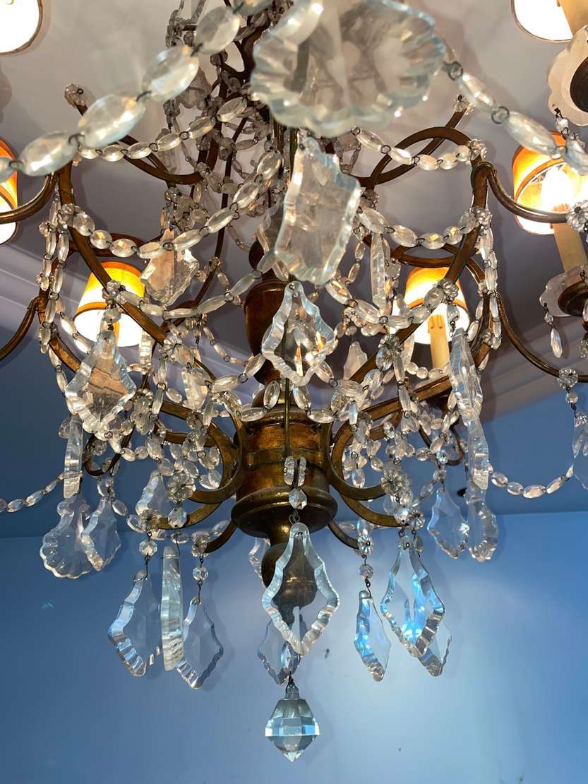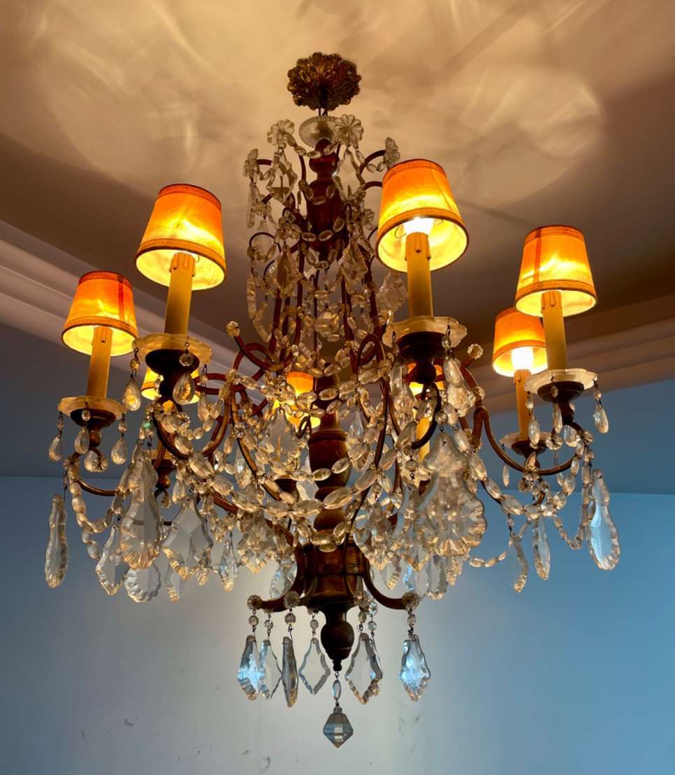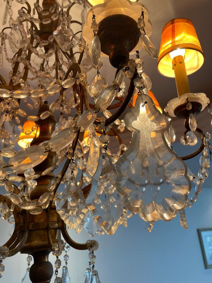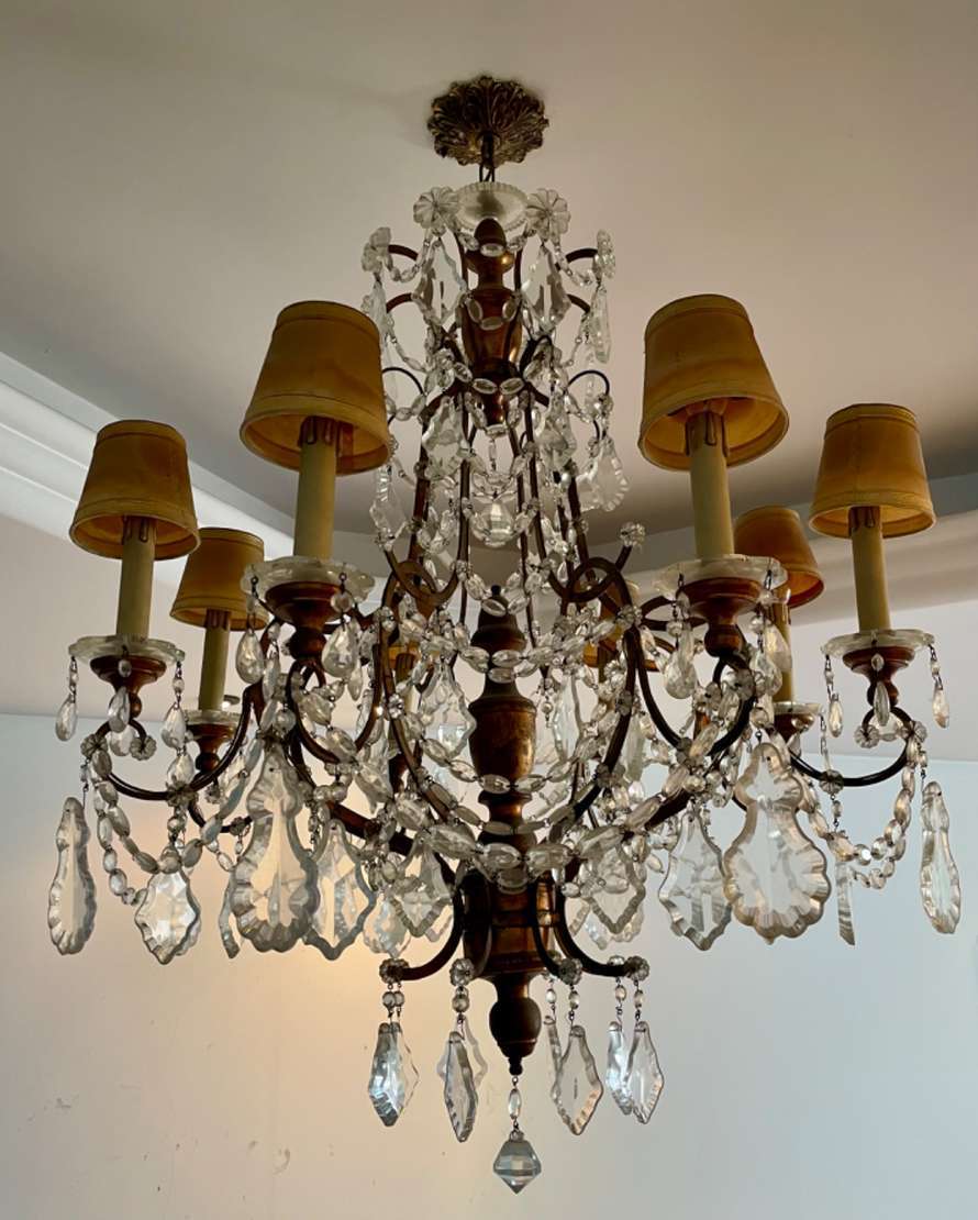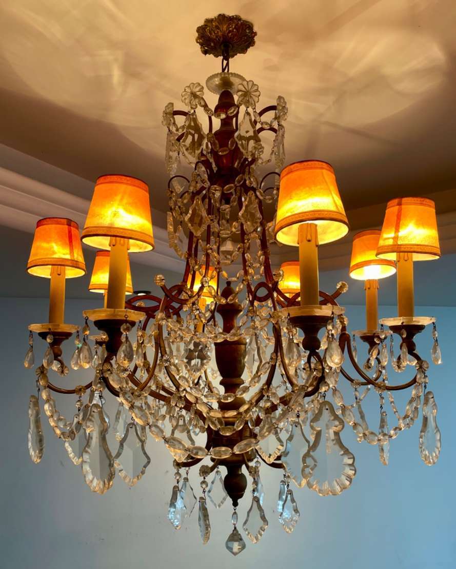 Lustre de madeira patinada para 6 luzes, detalhes com folhas douradas.