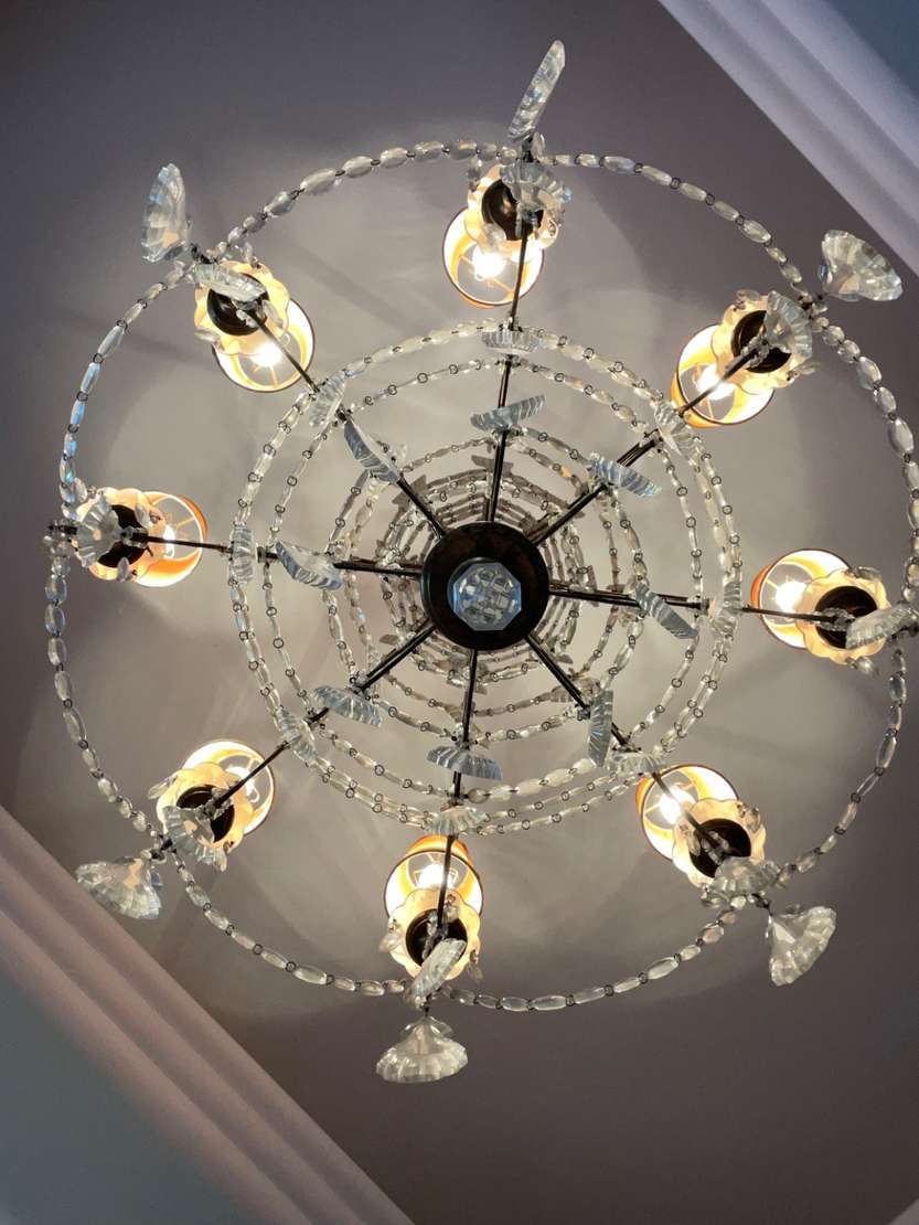 Lanterna na forma de globo de vidro lapidado, guarnição e correntes de metal.
