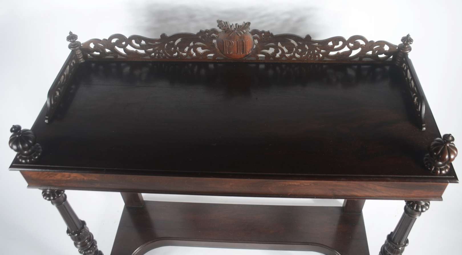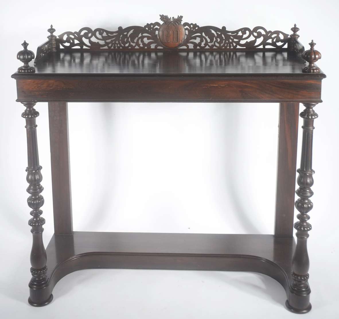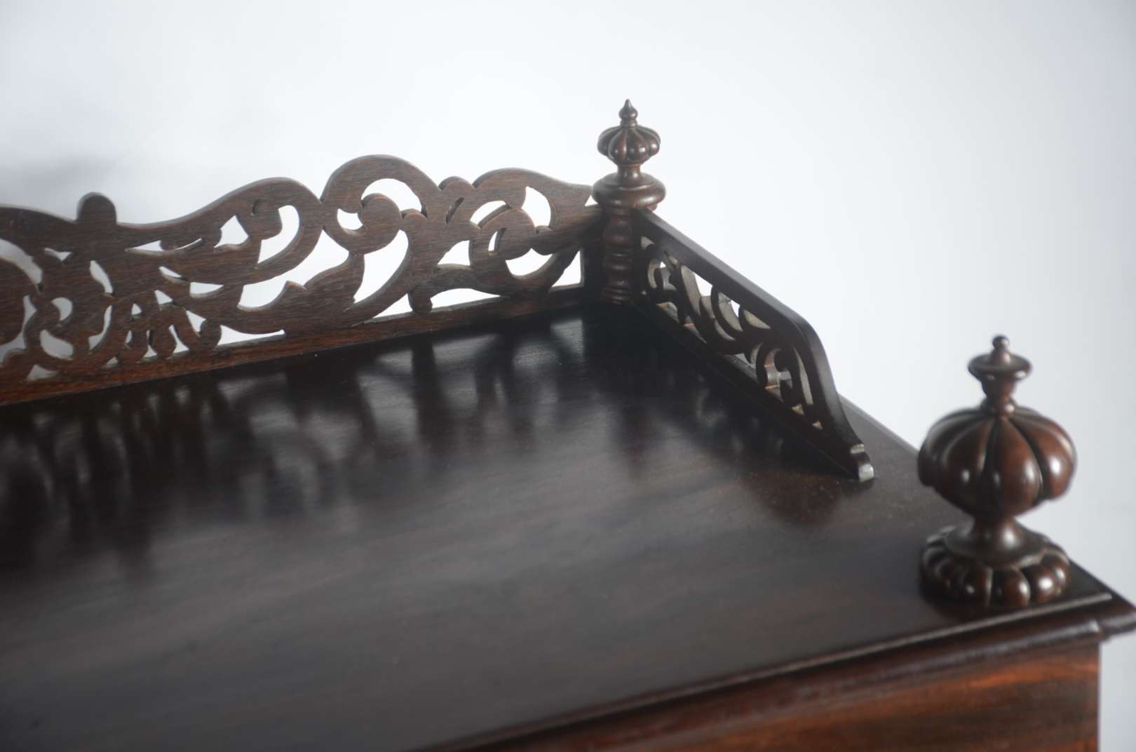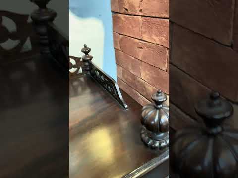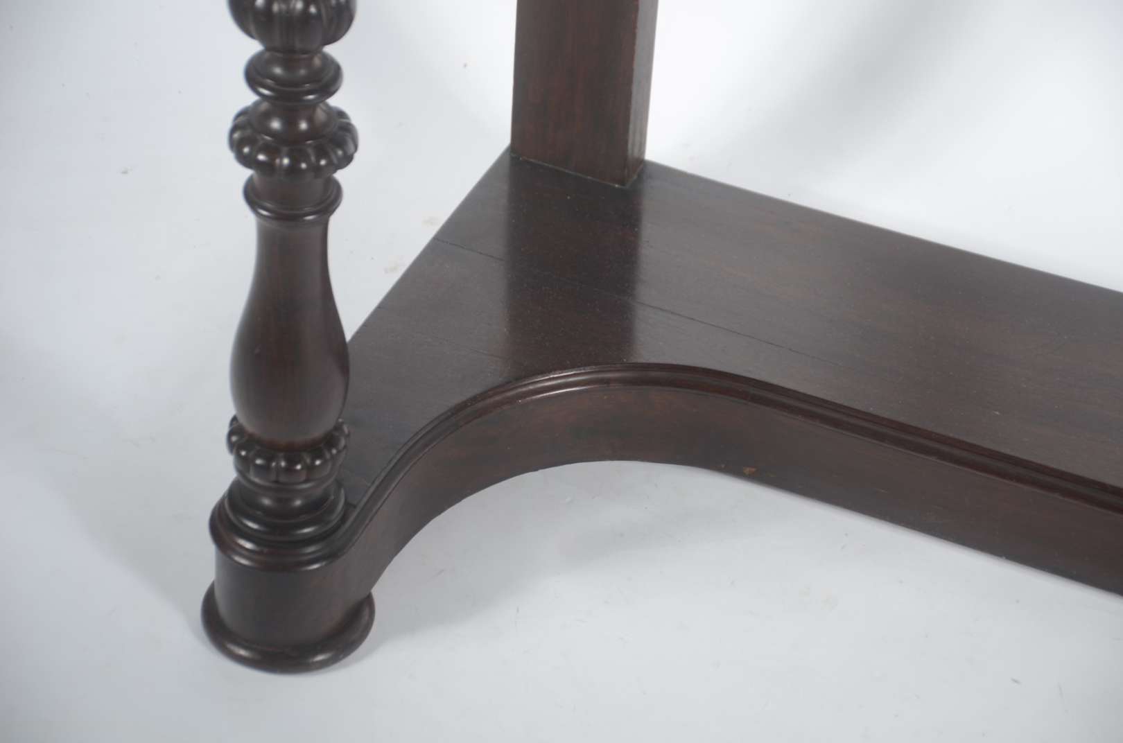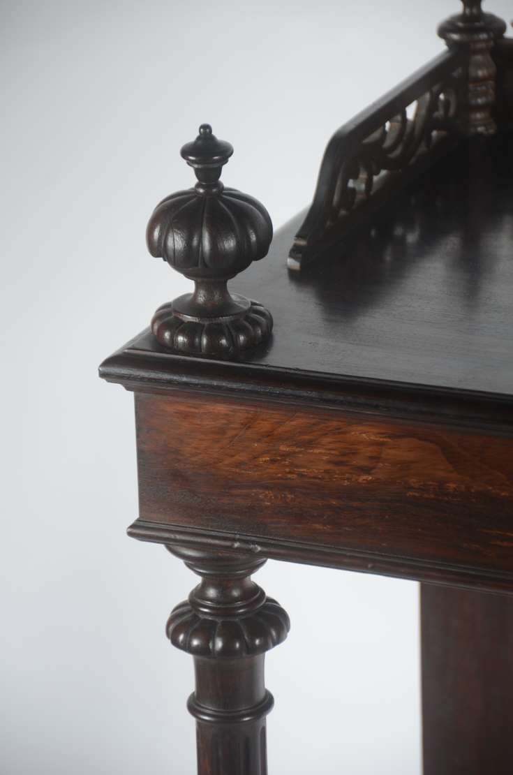 Aparador de madeira nobre, tampo retangular apoiado em coluna feitio "lira, terminando em quatro pernas recurvas.