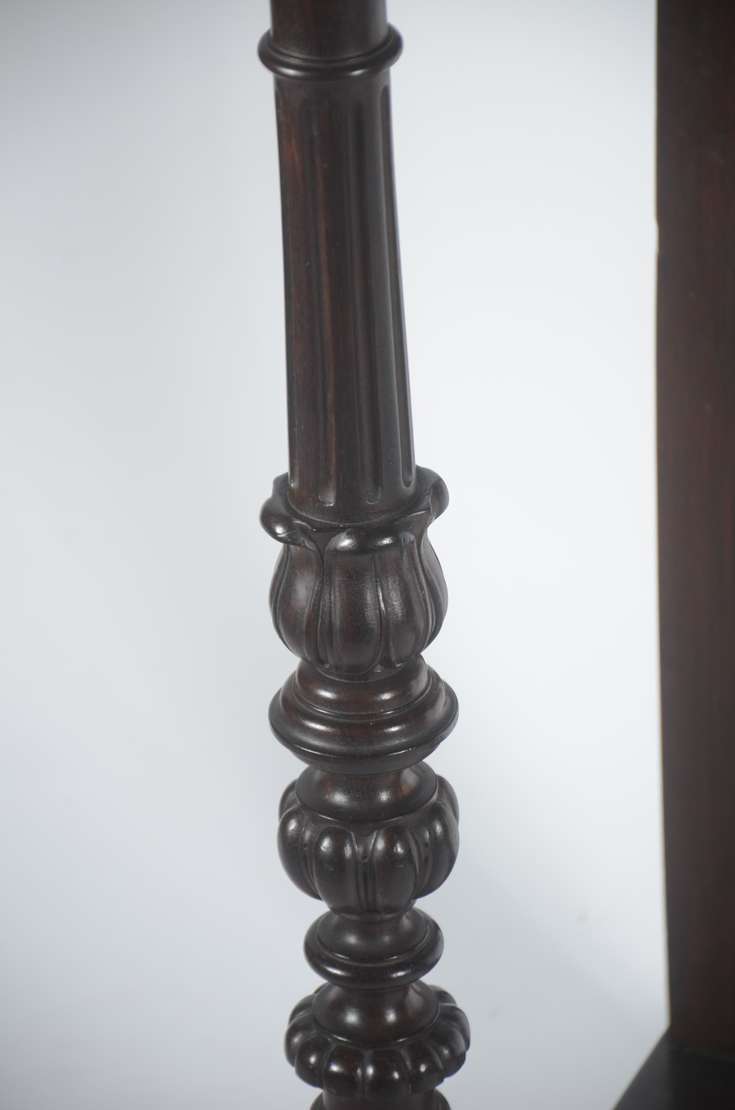 Mesa redonda de madeira nobre, apoio em coluna central torneada terminando em quatro pernas recurvas.