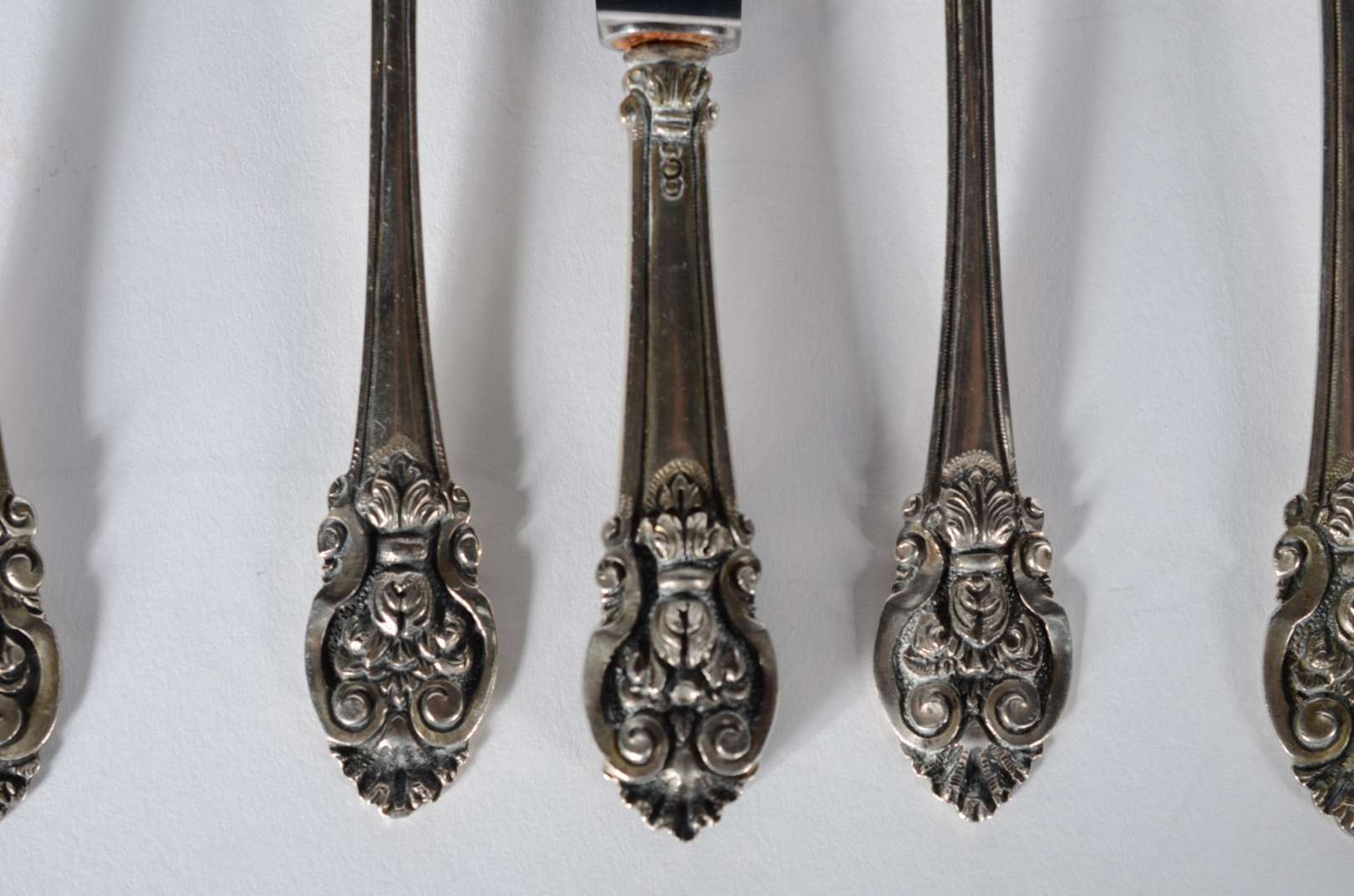 Baixela de jantar de metal prateado Saint James, composto de: sopeira, legumeira e 5 travessas. Total: 7 peças.