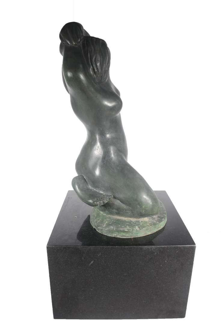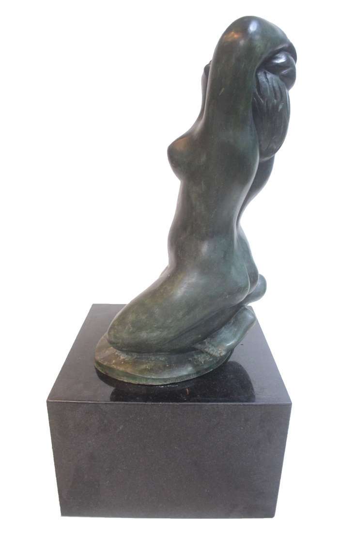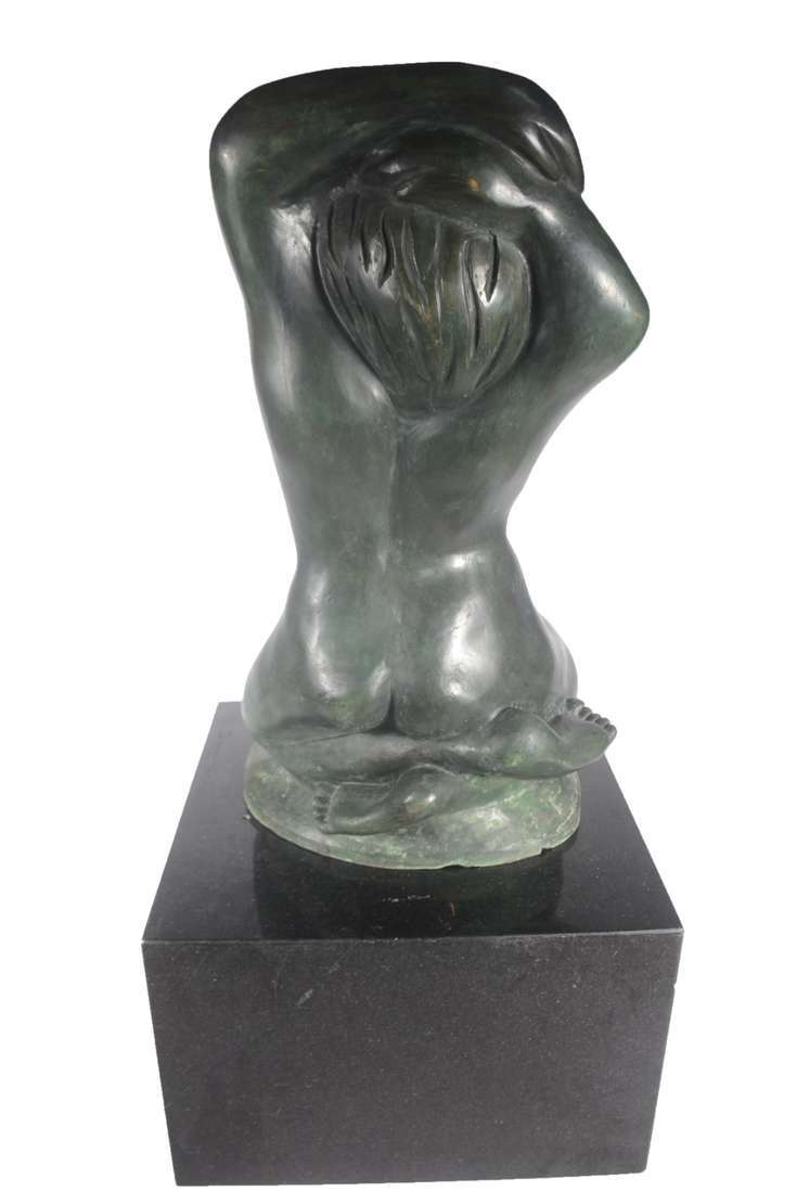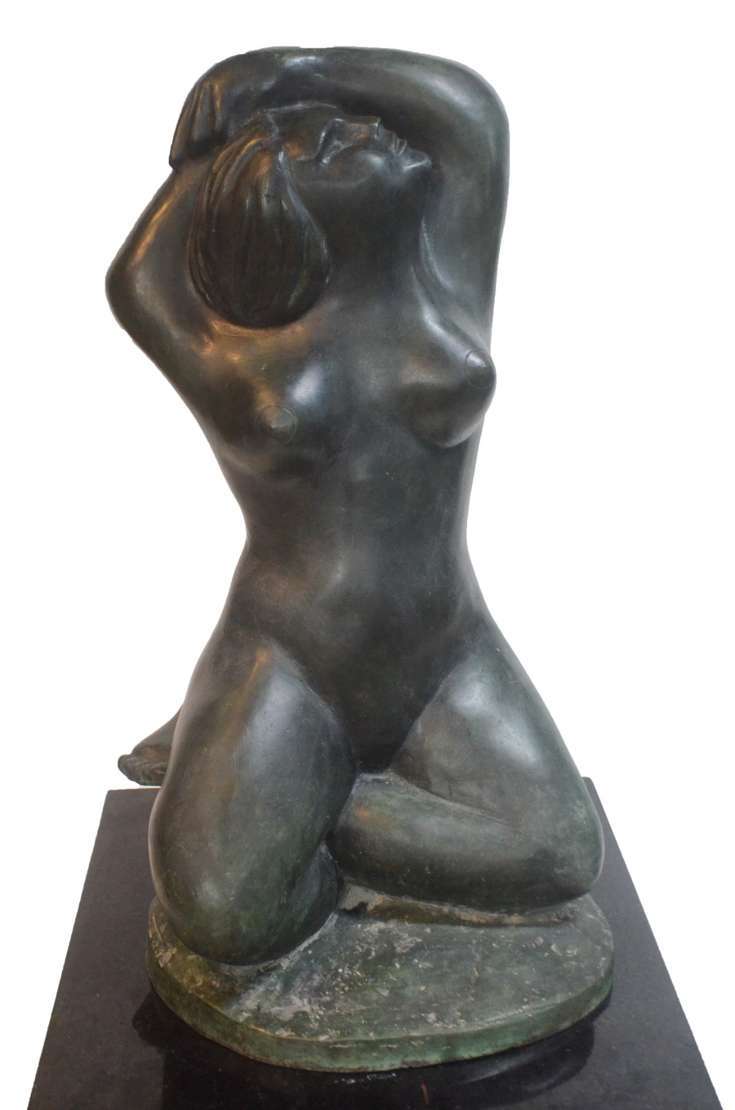 Escultura de bronze patinado representando figura feminina, base em granito. Década de 60. Selo da fundição Zani.