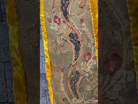 Antiga tapeçaria trabalhada com figura de ânfora com flores, borda com faixas amarelas e guirlandas coloridas, século XIX. Desgastes.