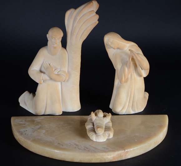Grupo escultórico de pedra representando Sagrada Família. Pequenos lascados.