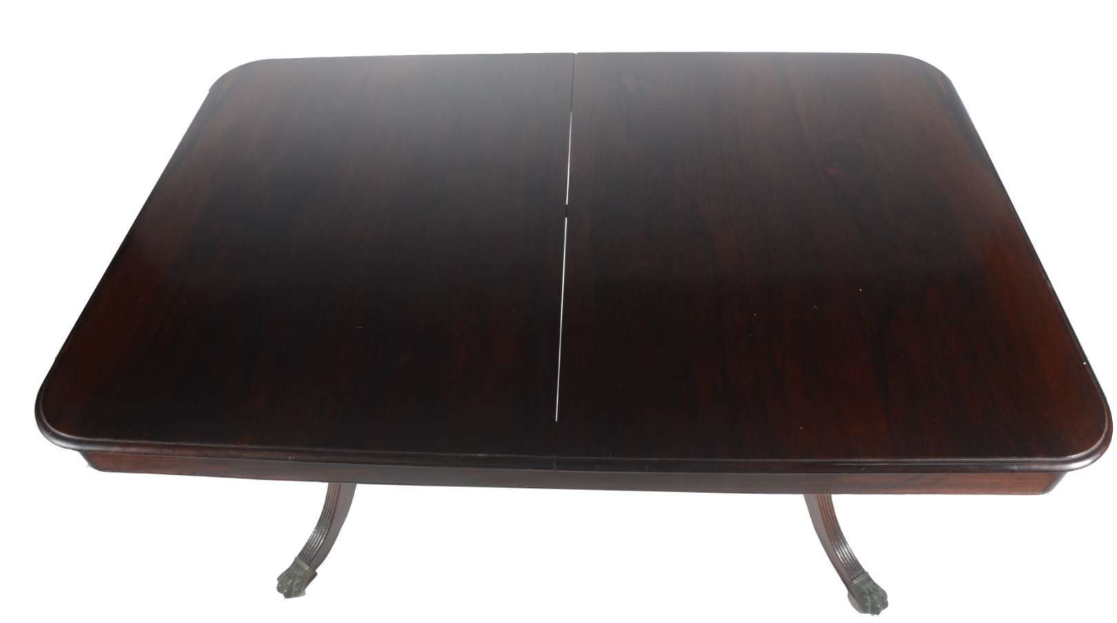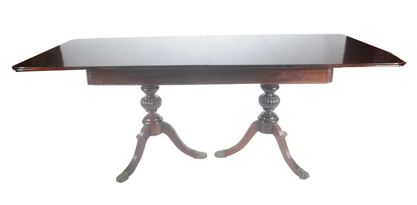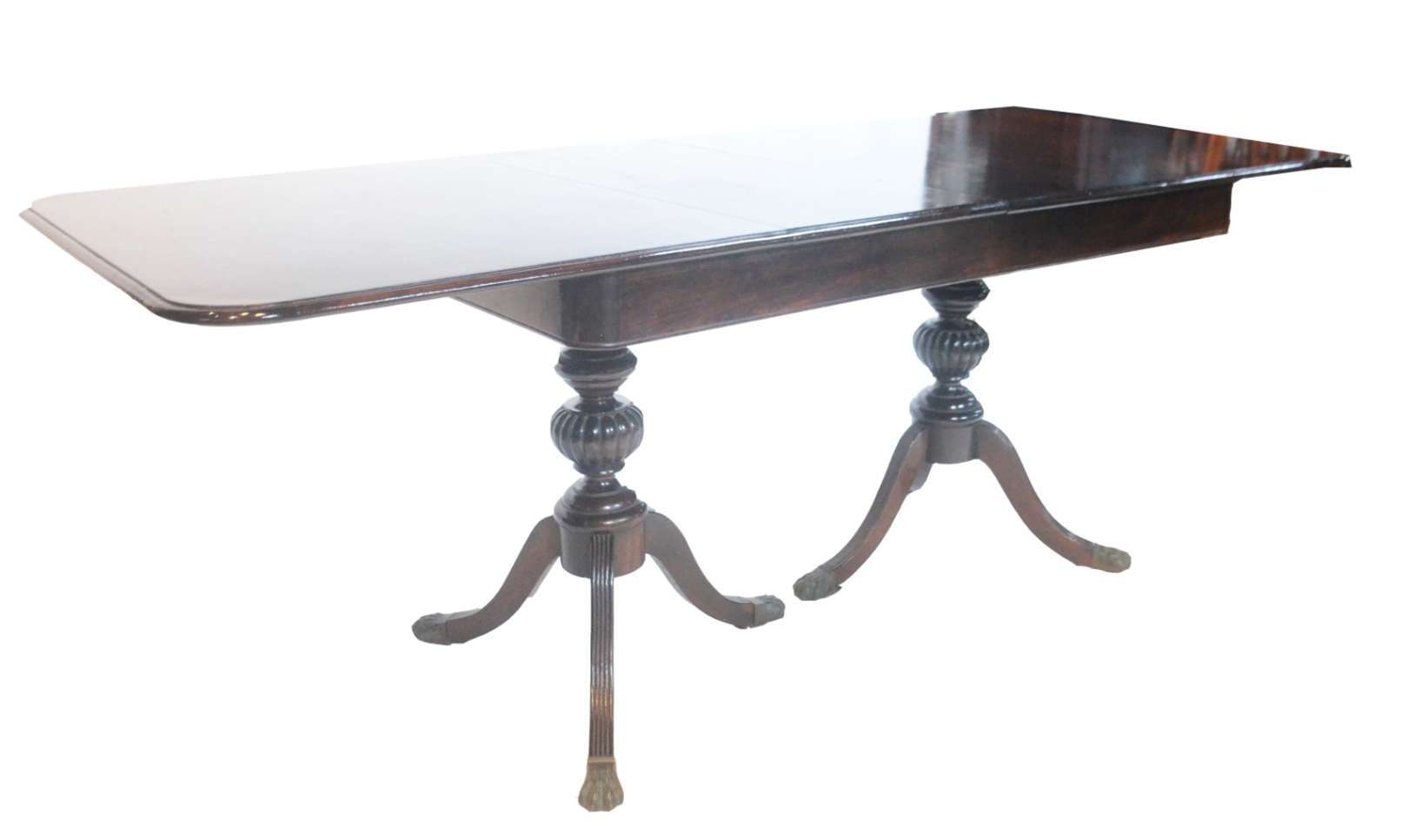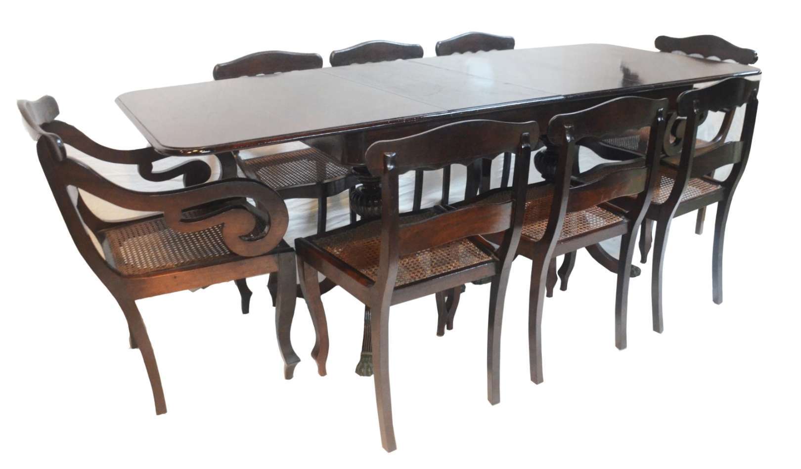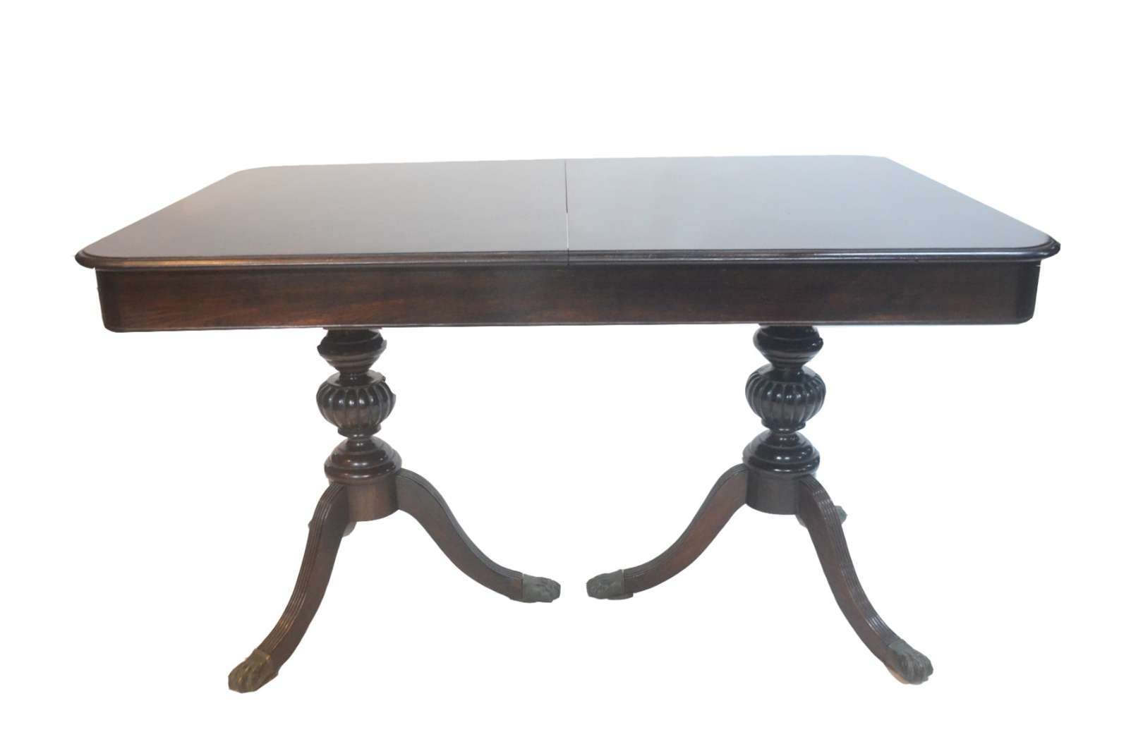 Mesa de jantar de madeira envernizada, duas tabuas extensoras (1,05 m. x 0,40 cm. cada) Base em duas colunas quadran...