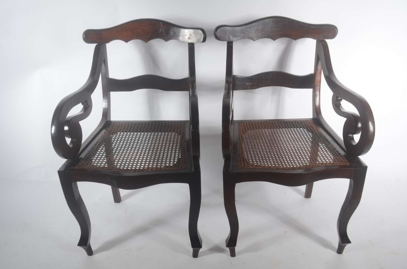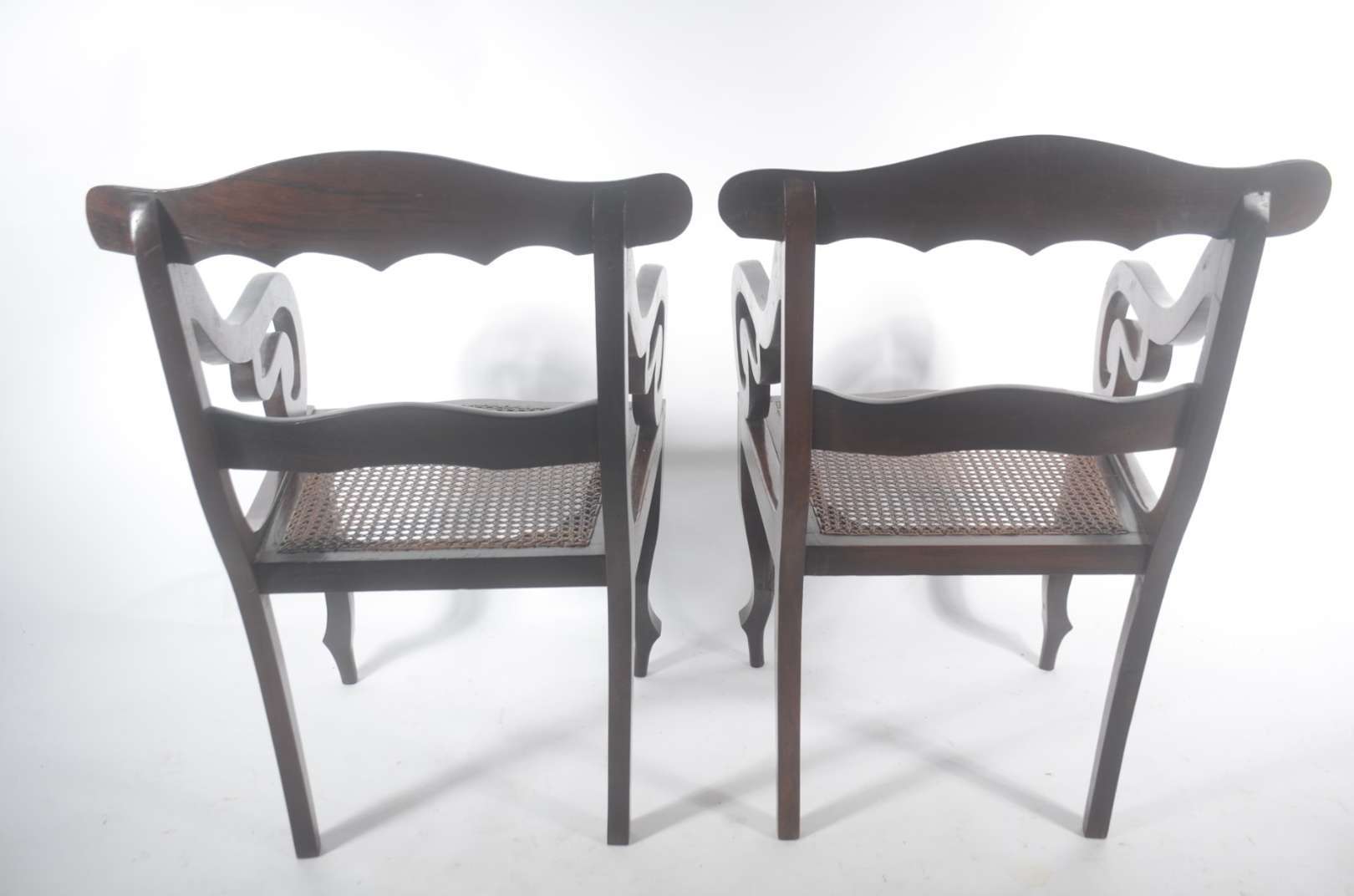 Cadeira baixa com braços de jacarandá, estilo Dom José, espaldar entalhado com cartelas e volutas, tabelas vazadas, a...