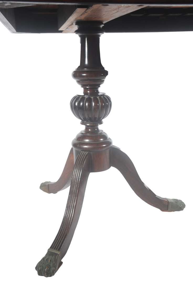 Aparador de madeira nobre, tampo retangular apoiado em coluna feitio "lira, terminando em quatro pernas recurvas.