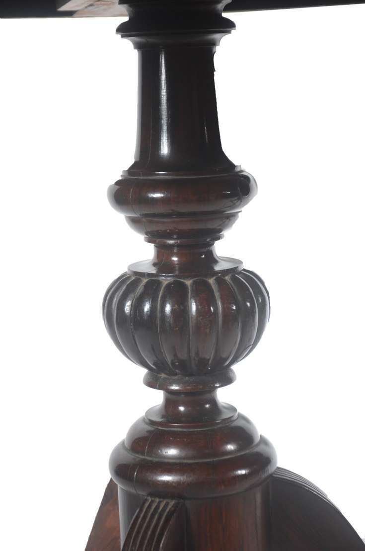 Rara e elegante credência em madeira jacarandá com tampo retangular, ornado nas quinas por bilros torneados e esculpi...