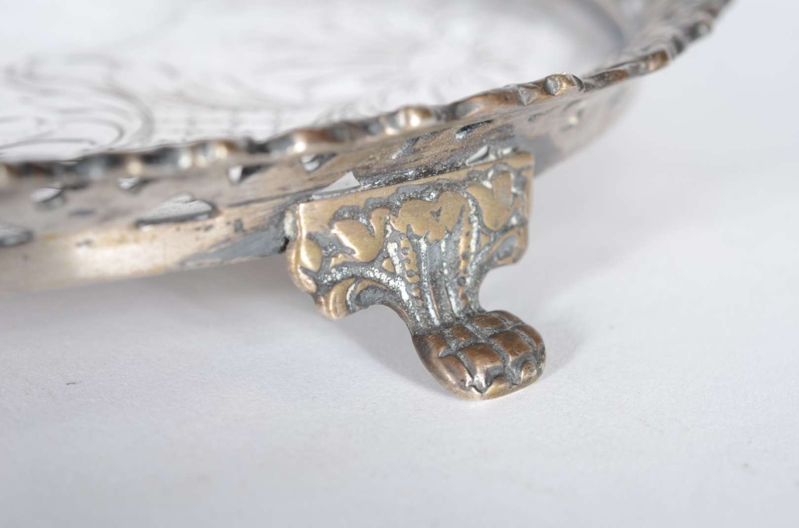 Dois pratos de vidro trabalhados com guirlandas geométricas na cor branca e frisos dourados.