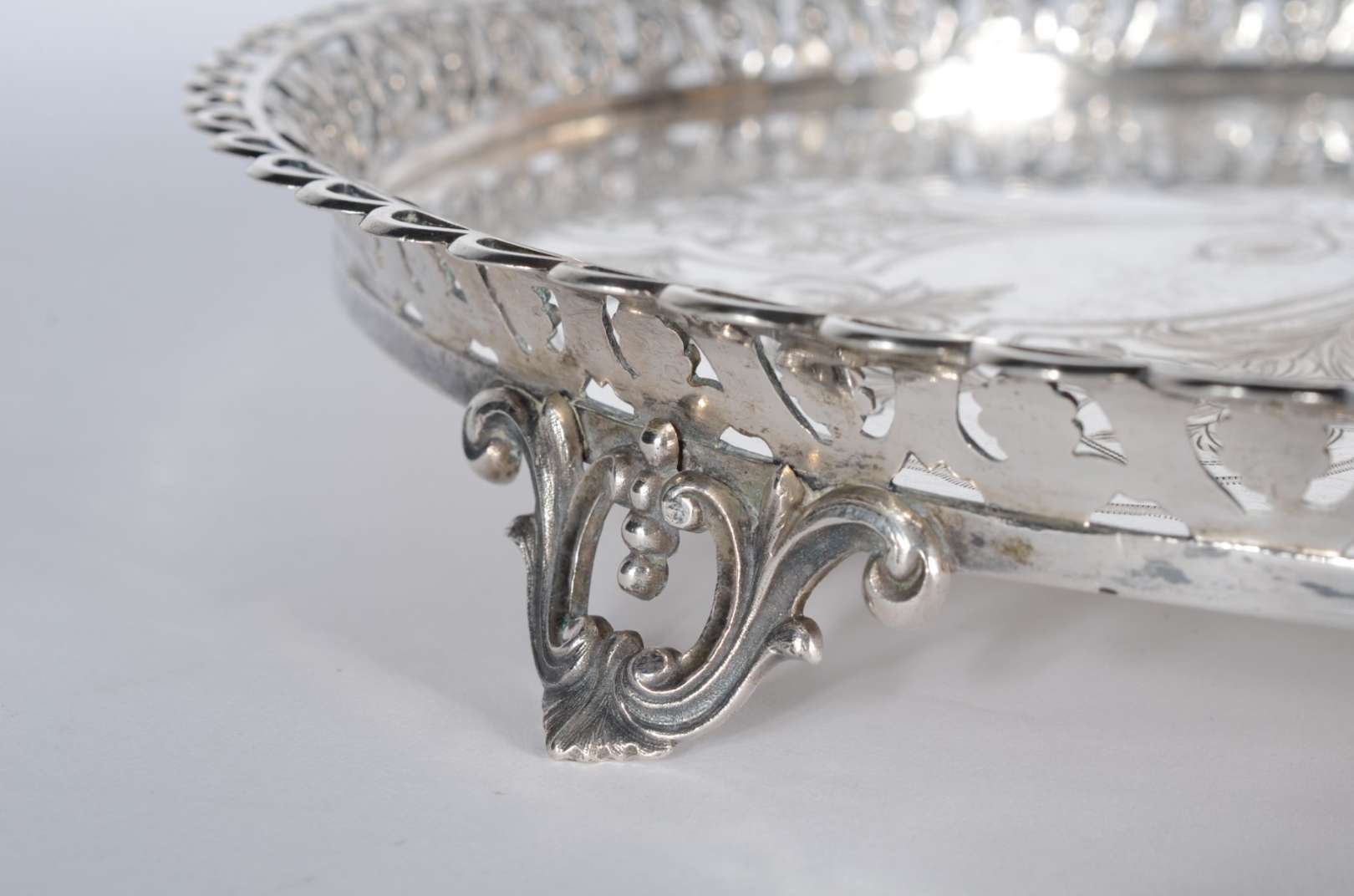 Travessa para peixe de porcelana francesa A.L.Garraux, com placa vazada sobreposta, decoração floral e borboletas em...