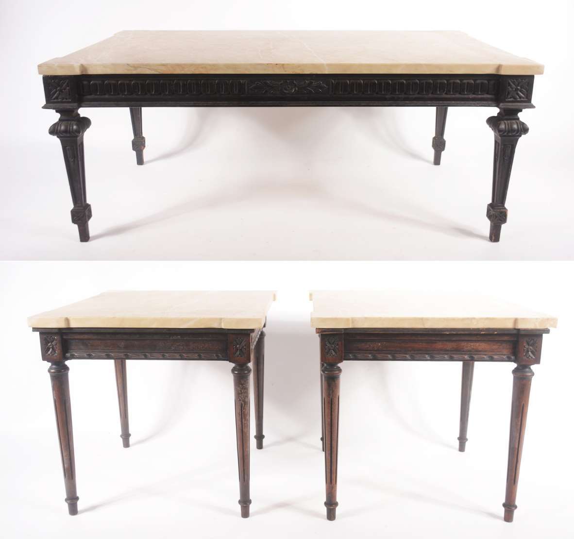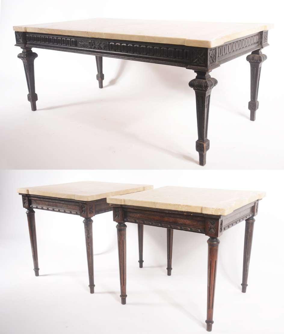 Conjunto com 3 mesas de jacarandá, sendo: par de mesas laterais e uma mesa de centro com tampo de mármore (quebrado e...