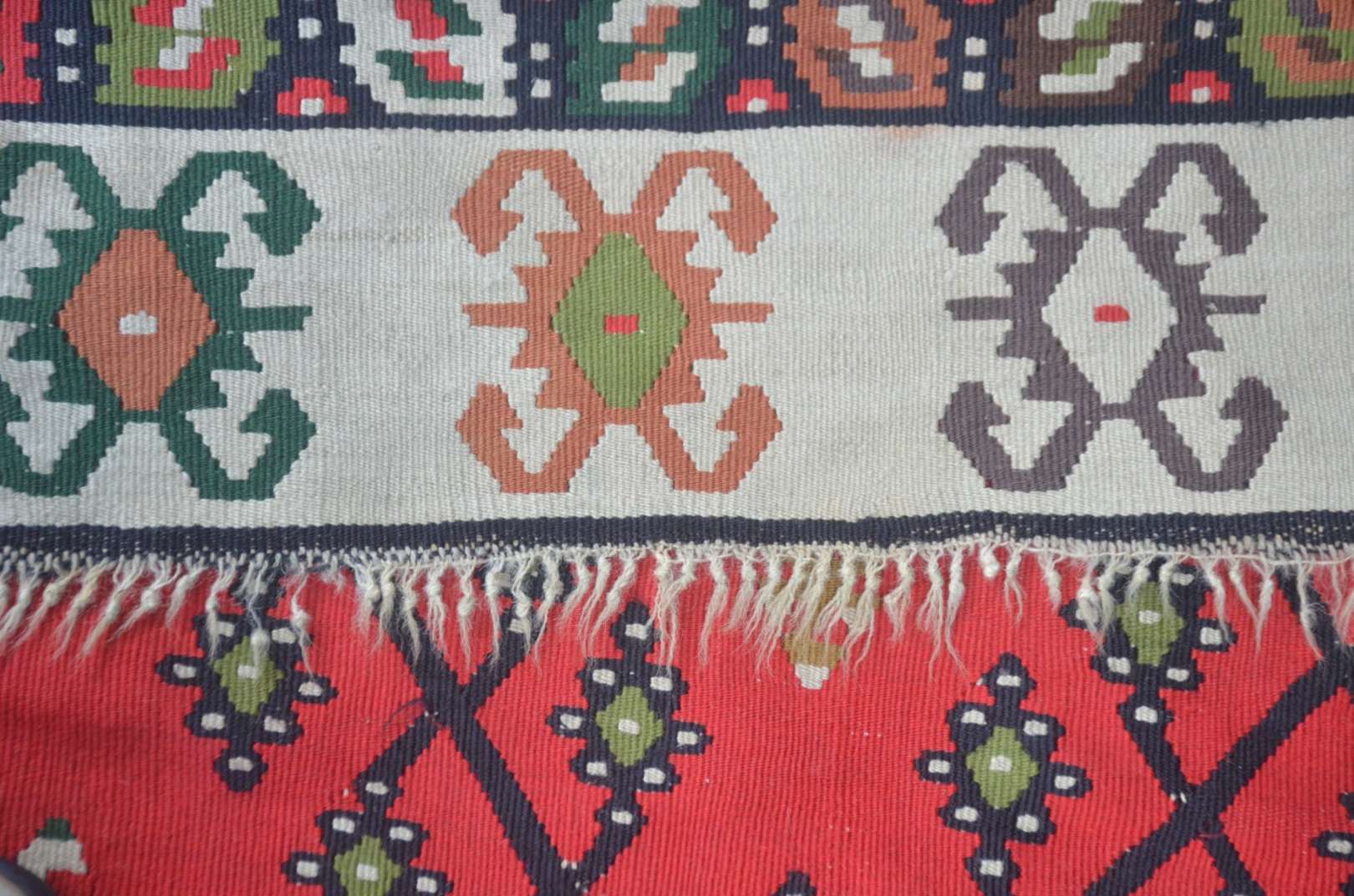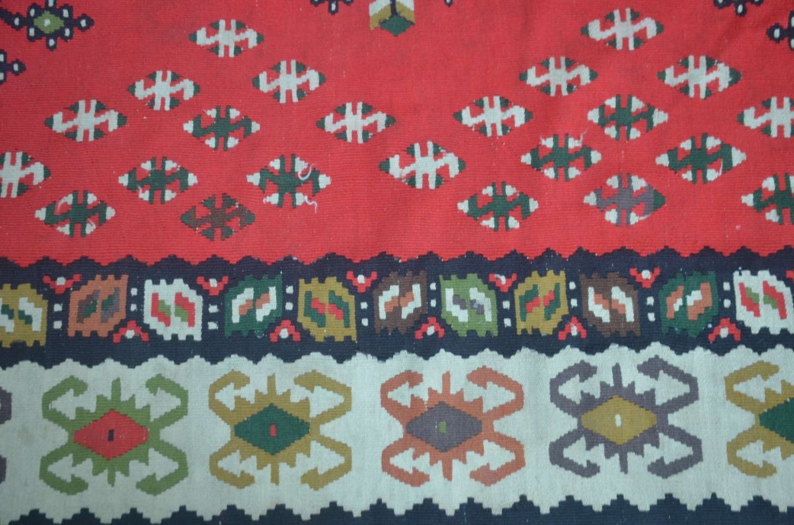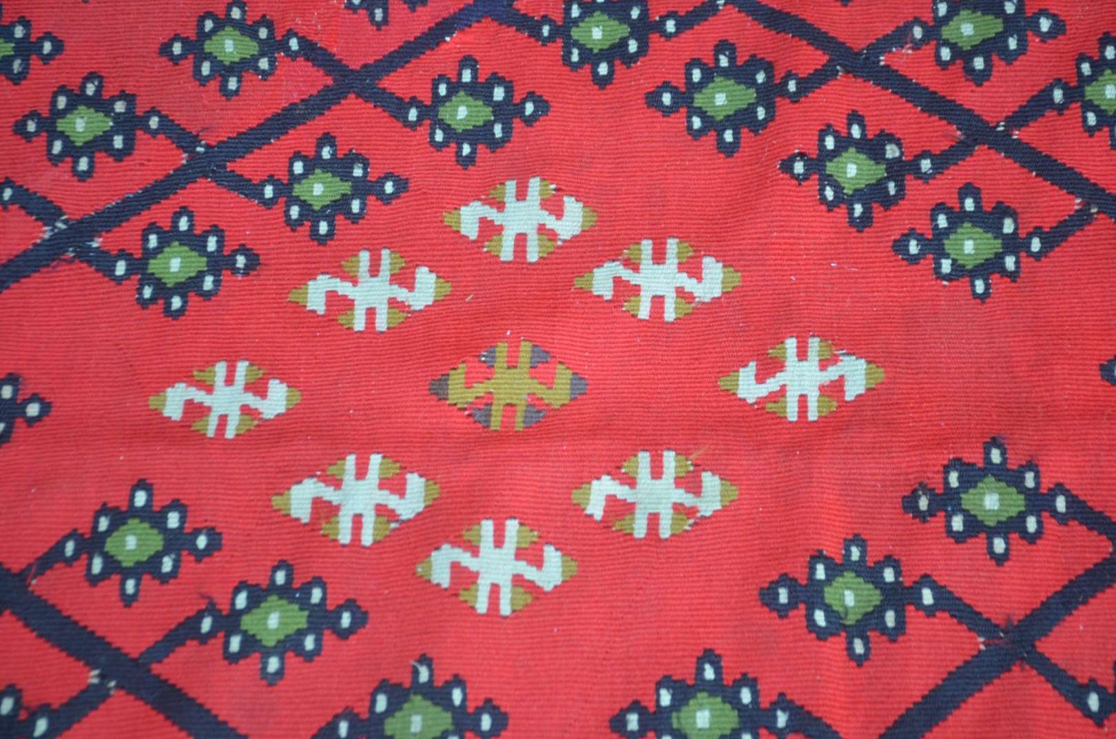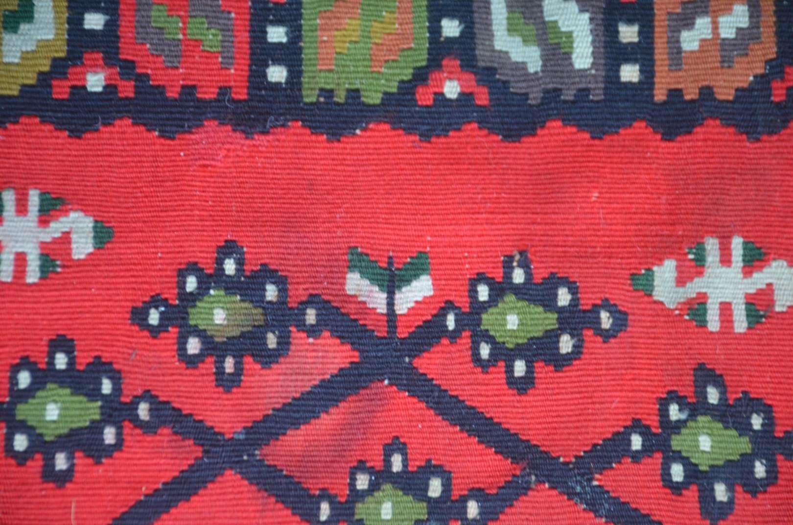 Antiga tapeçaria trabalhada com figura de ânfora com flores, borda com faixas amarelas e guirlandas coloridas, século...