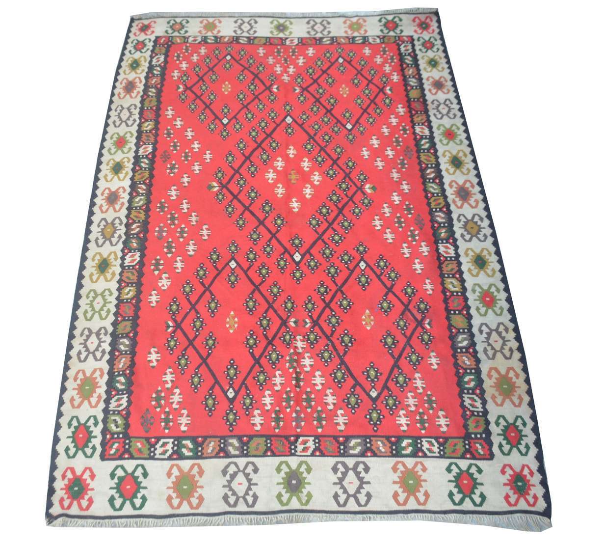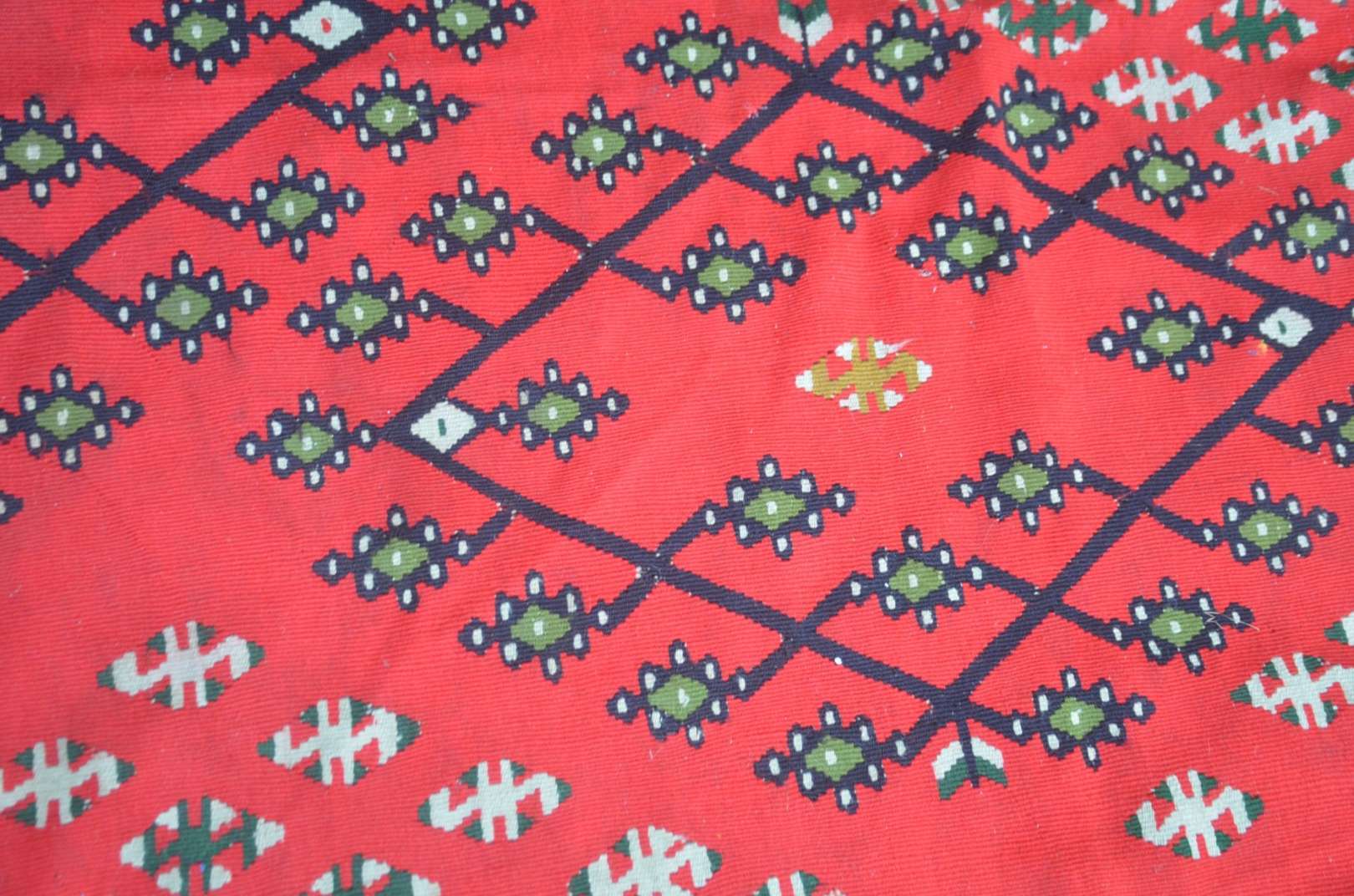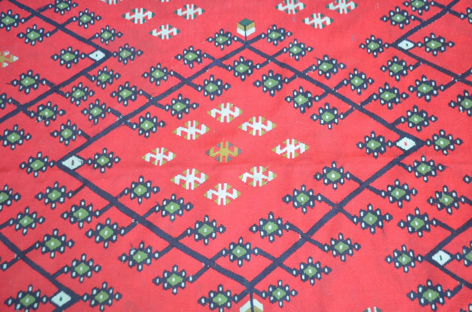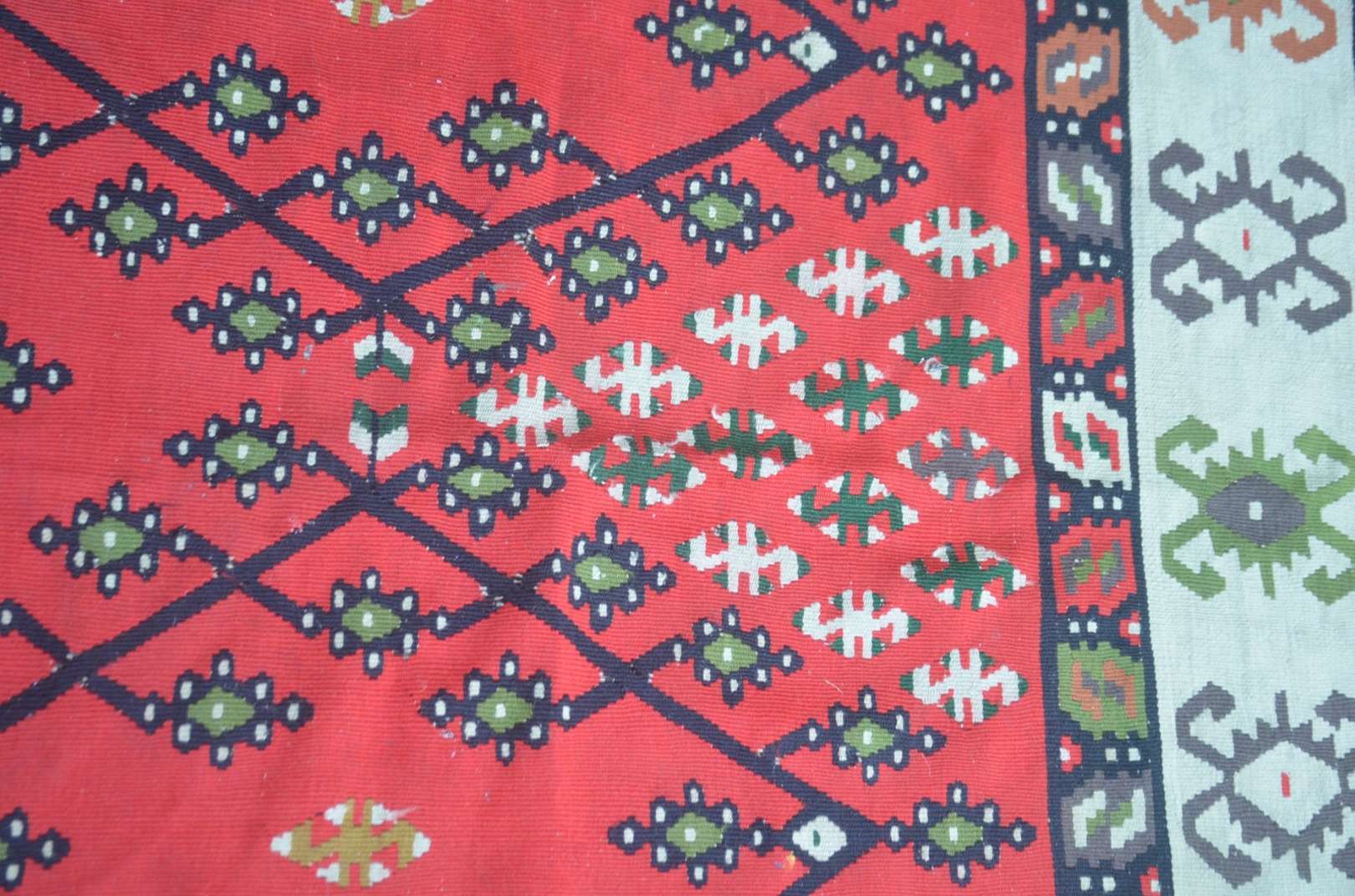 Antiga tapeçaria trabalhada com figura de ânfora com flores, borda com faixas amarelas e guirlandas coloridas, século...