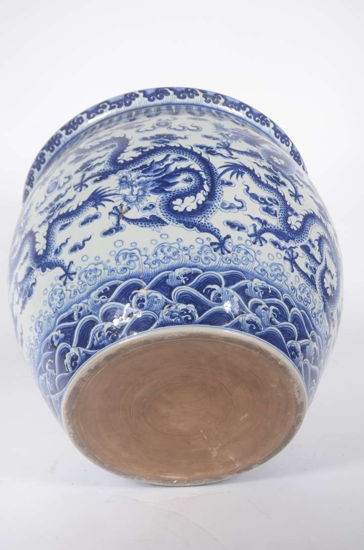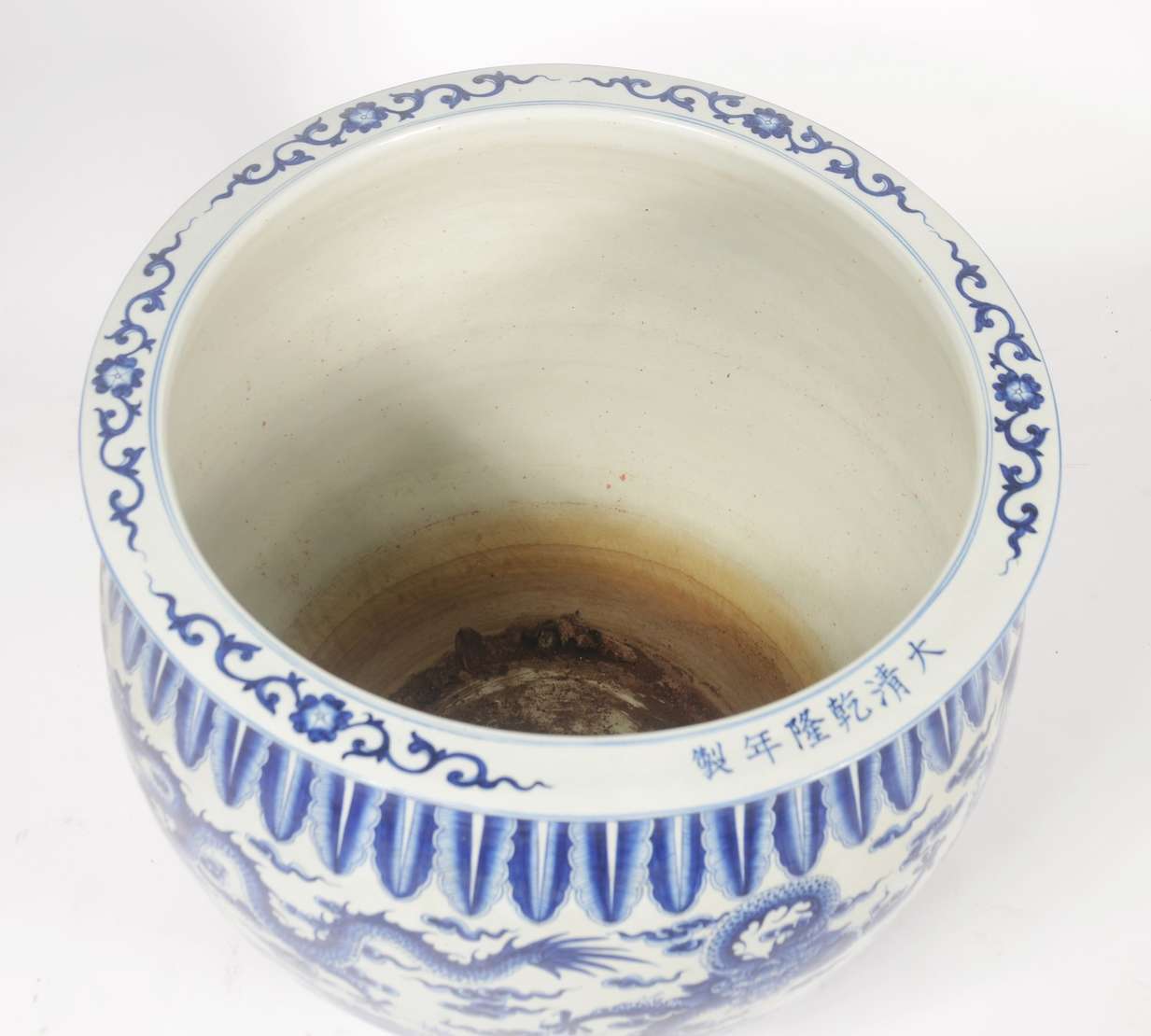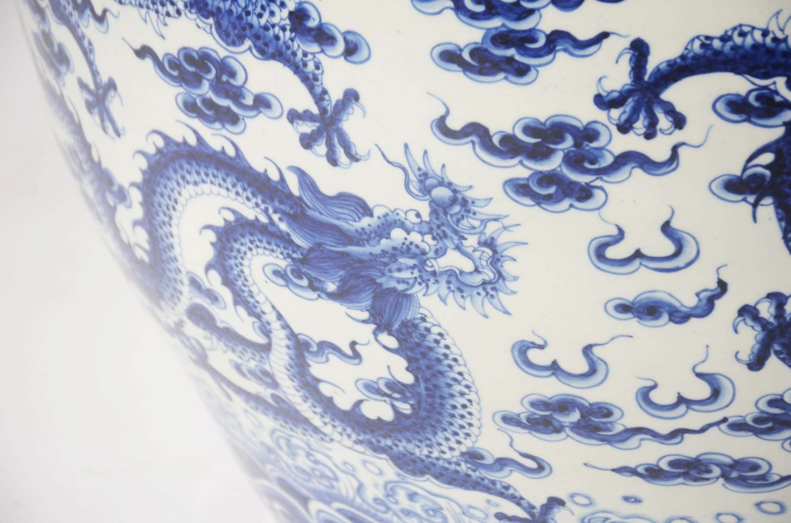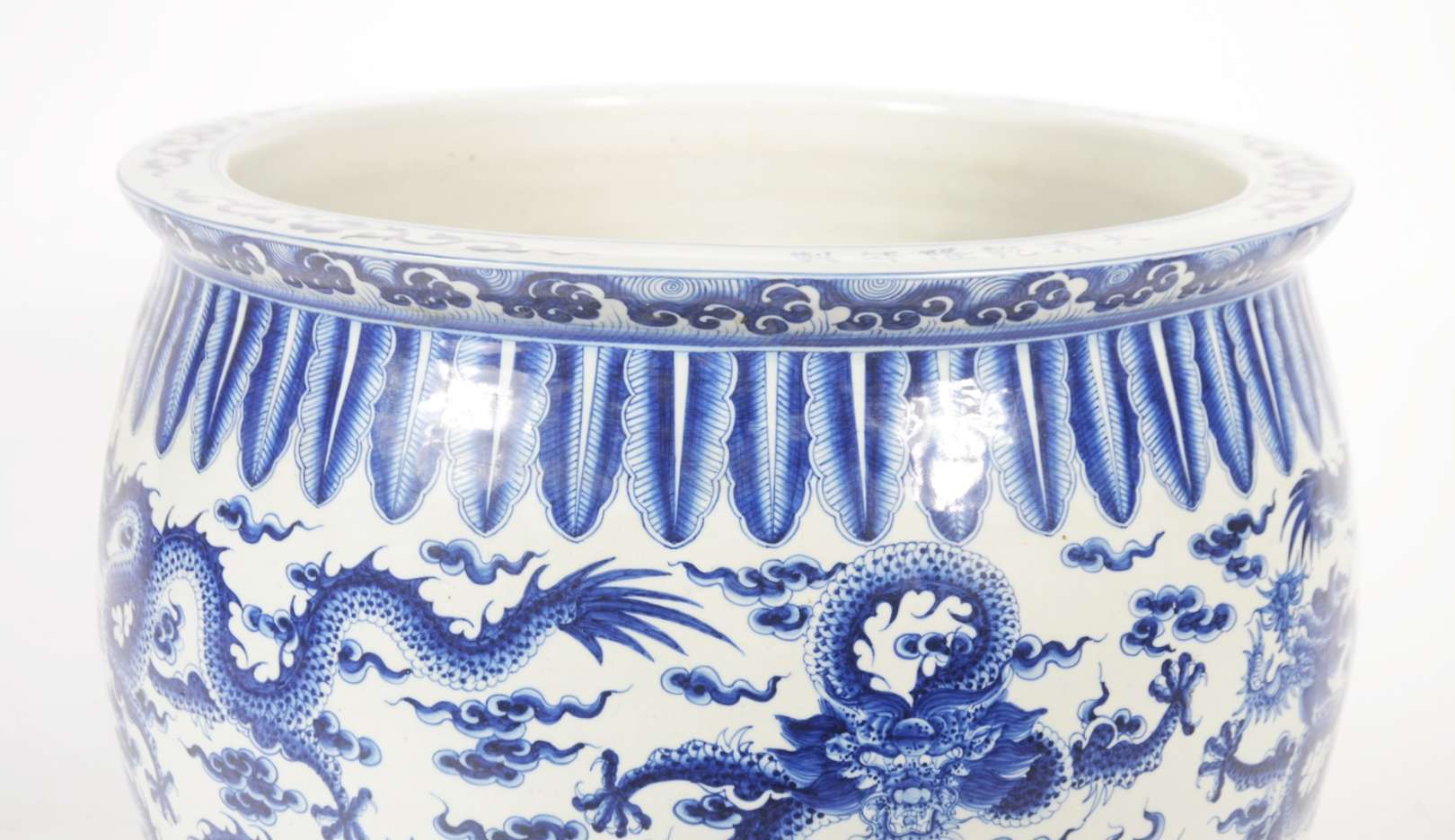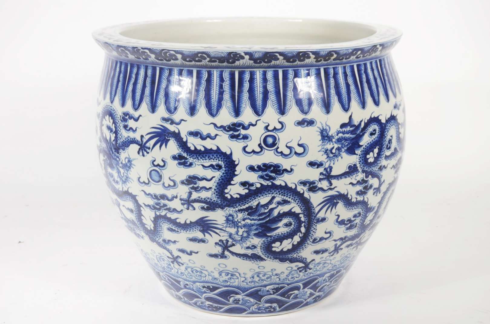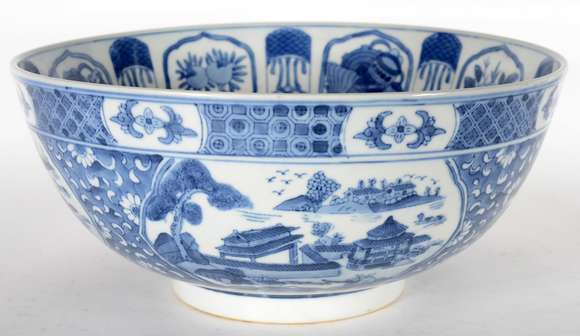 Grande bowl de porcelana chinesa decorada com pagodes e guirlandas em azul e branco.